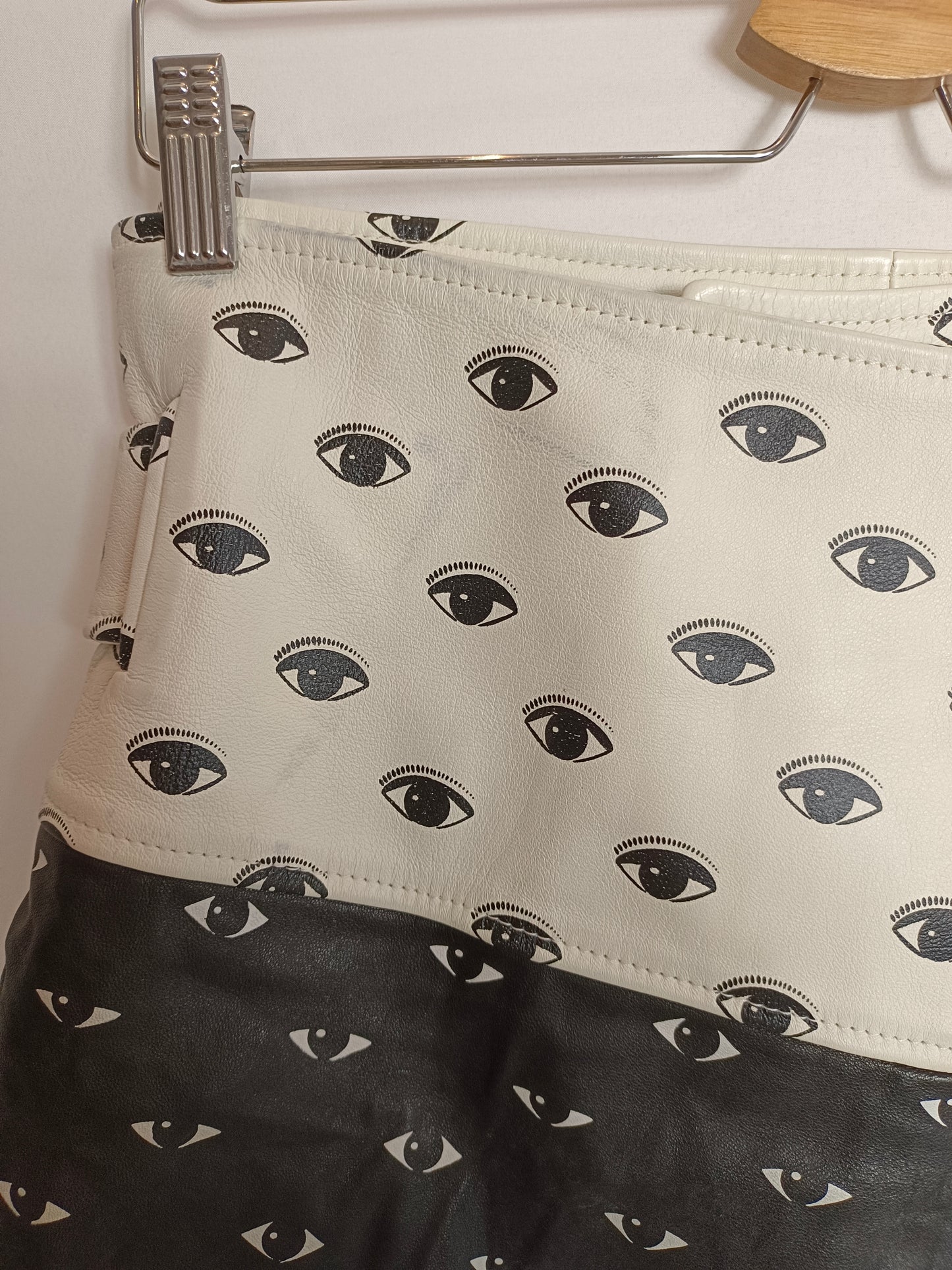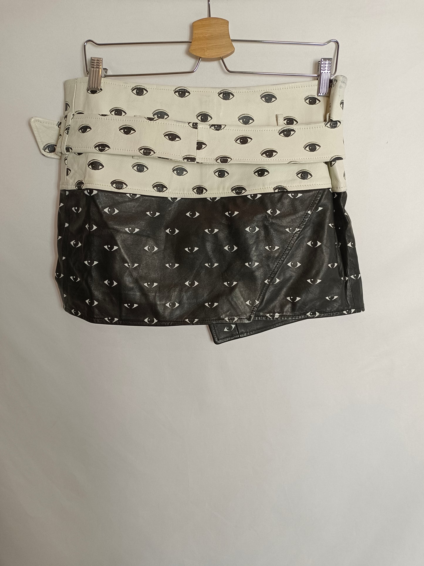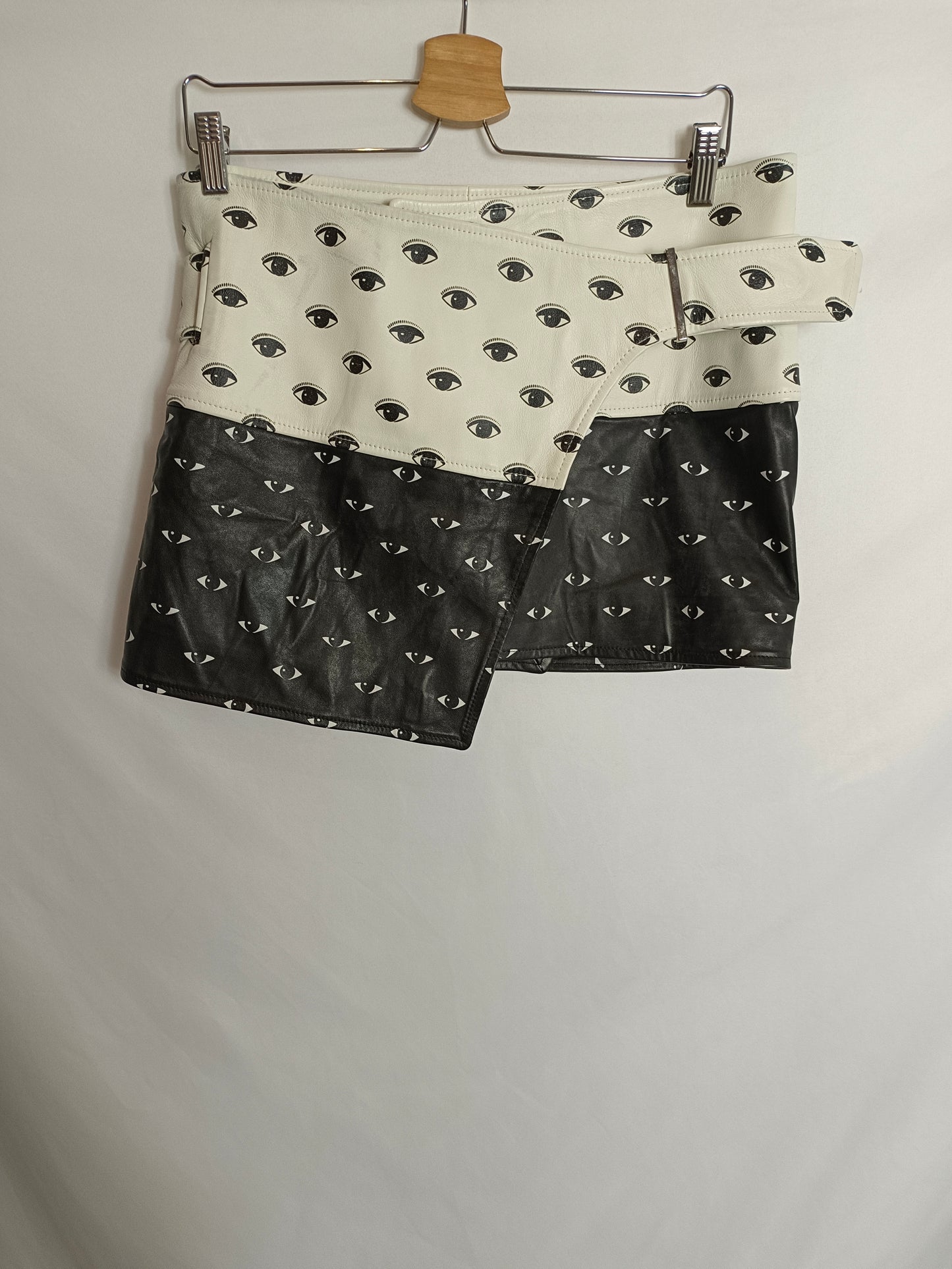 Falda corta negra con estampado de ojos. 100%piel y cruzada. Tara: alguna zona desteñida