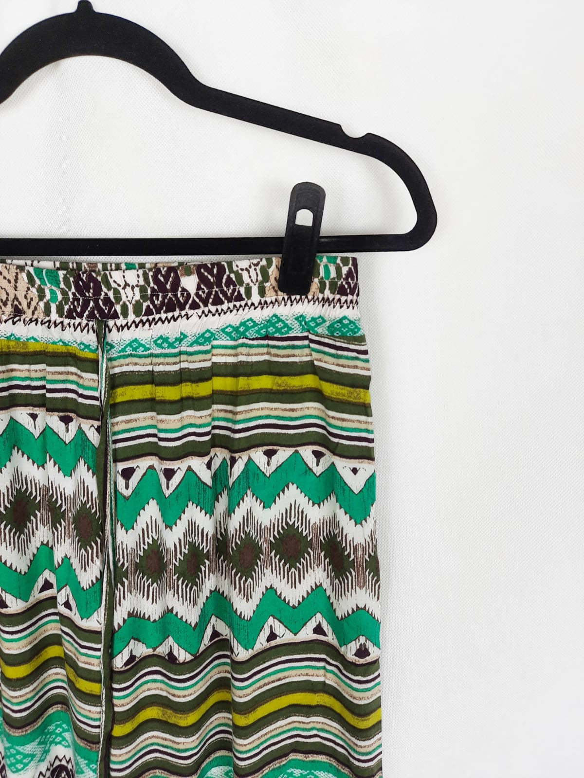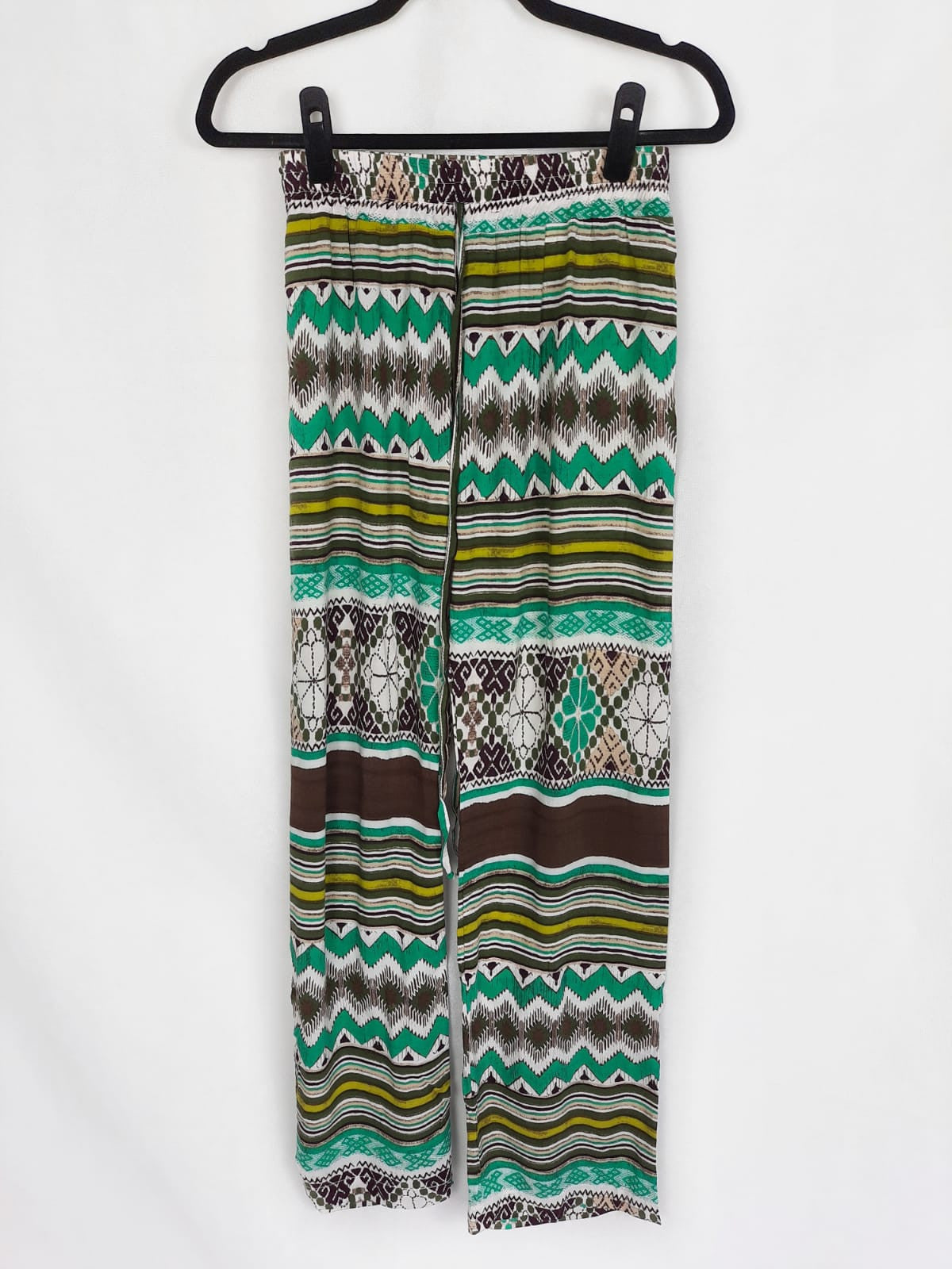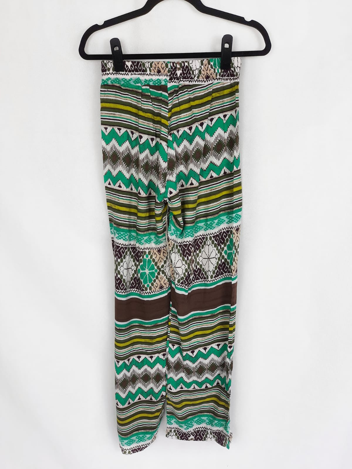 Pantalón fluido con estampado étnico. Sin finito y con cintura elástica. Largo 106 cm