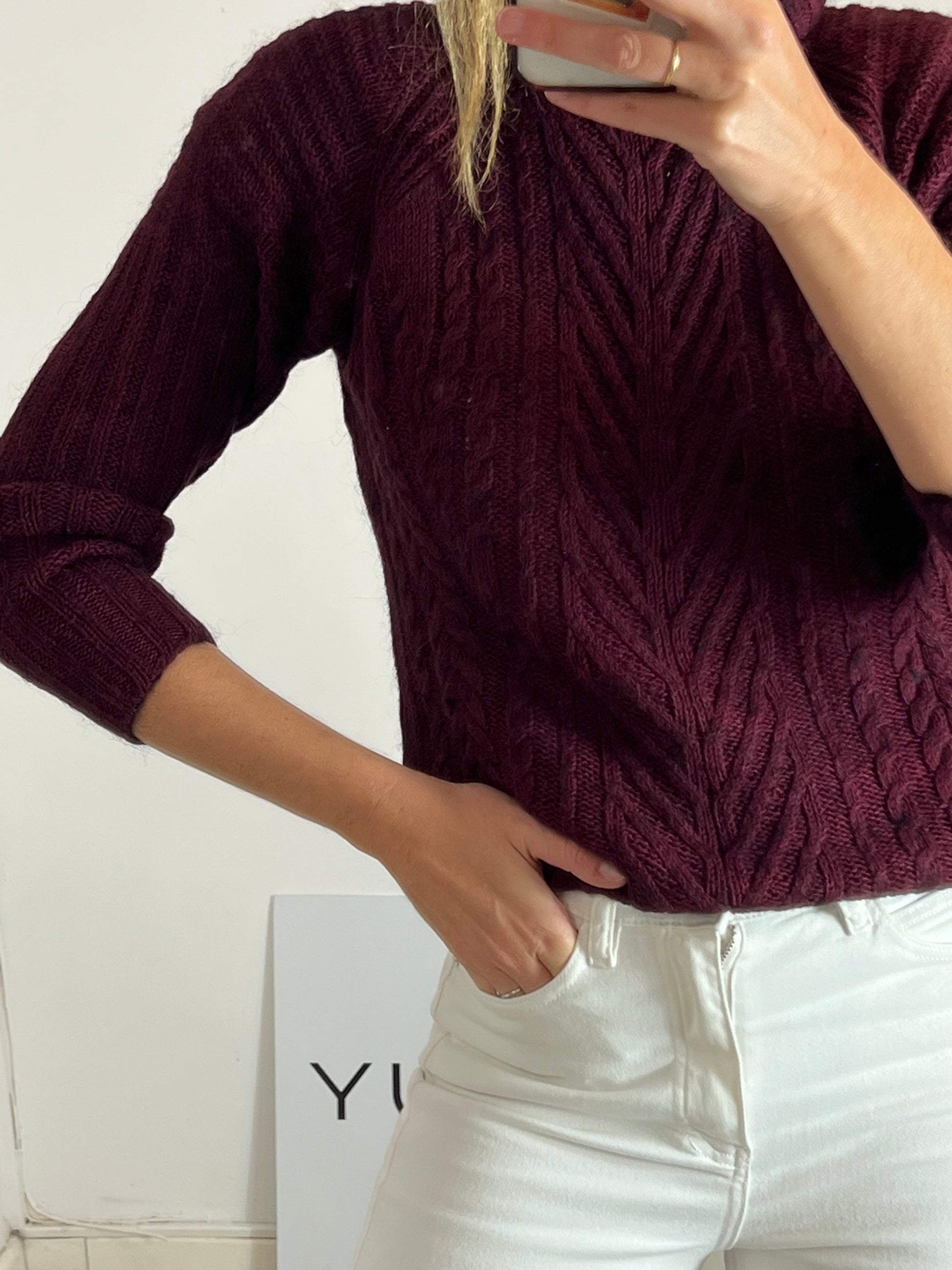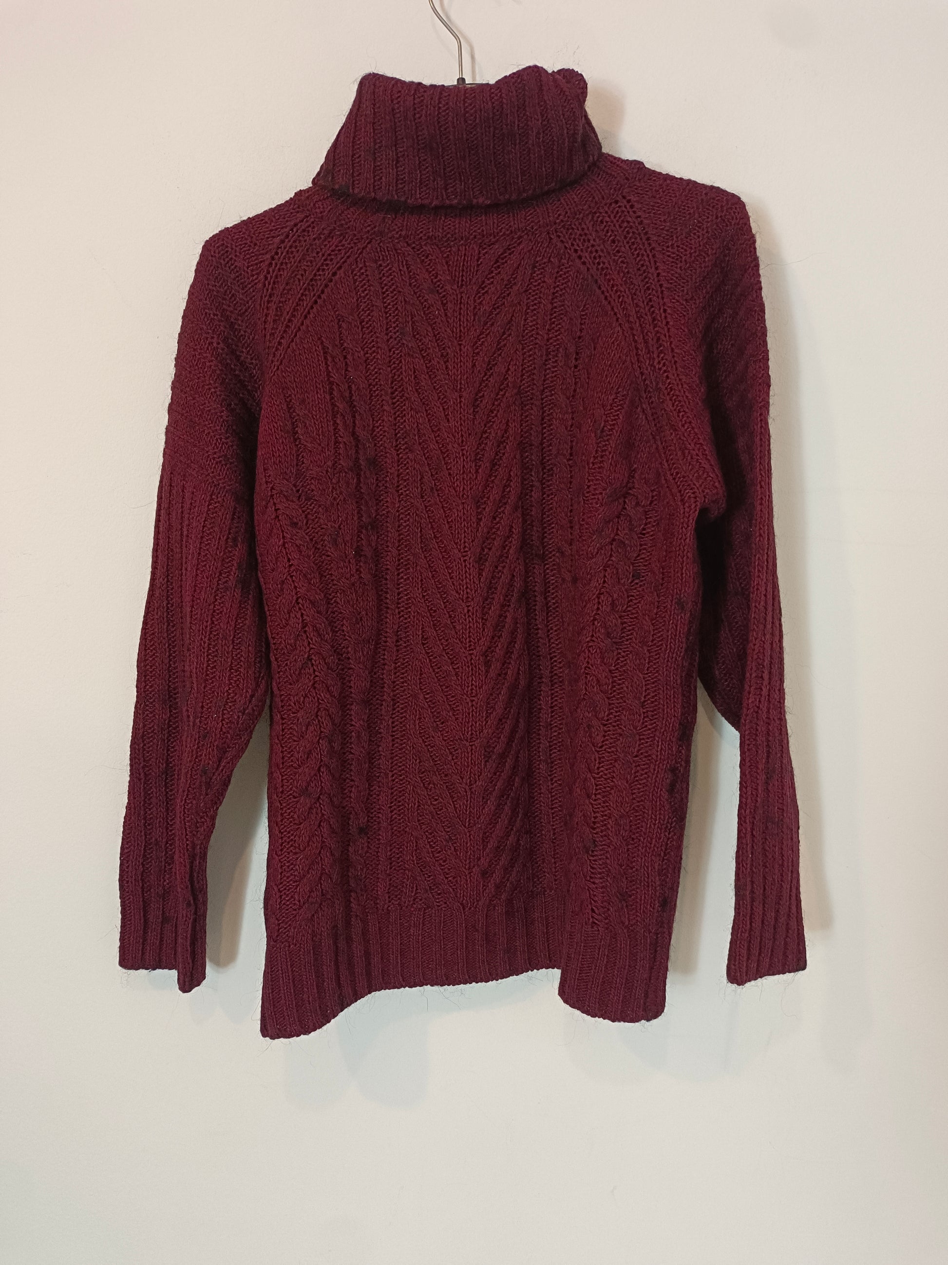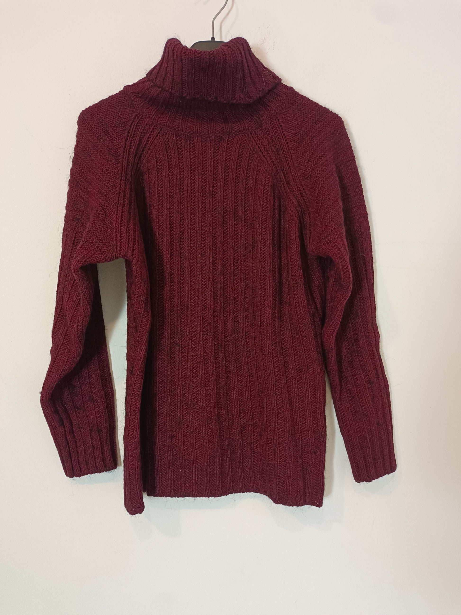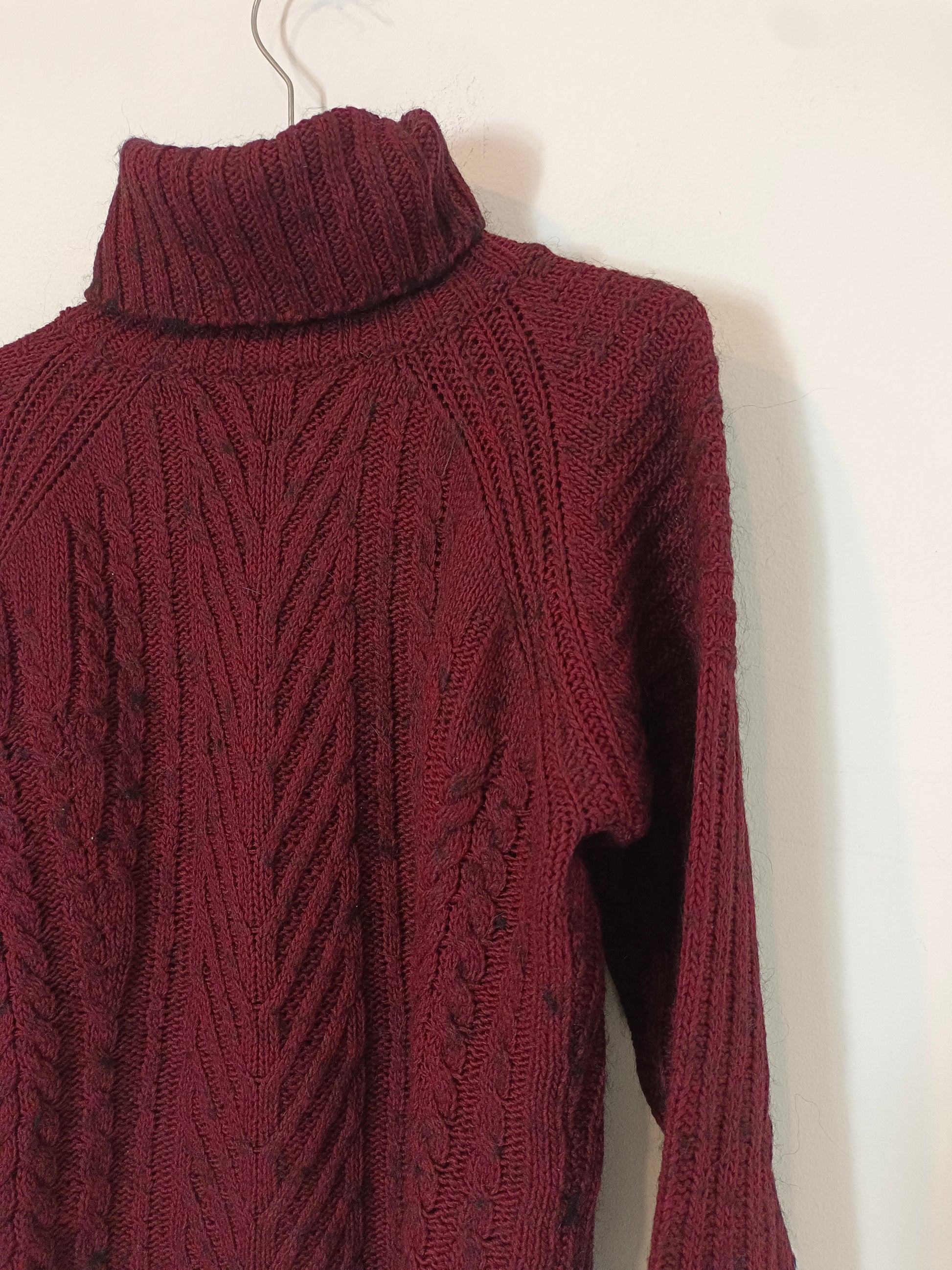 Jersey burdeos con detalles jaspeados. Tejido de canalé cuello alto.