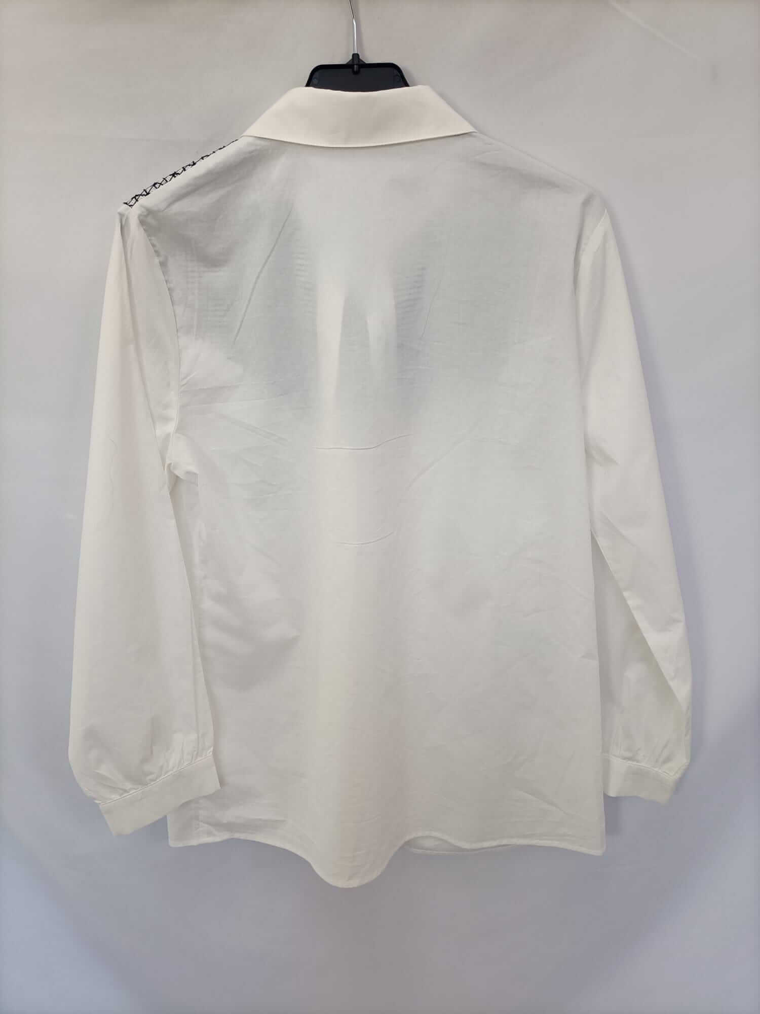 blusa blanca fluida con detalle bordado en negro en el escote. No elástica. 100% algodón. De sisa a sisa 53 cm largo 74 cm