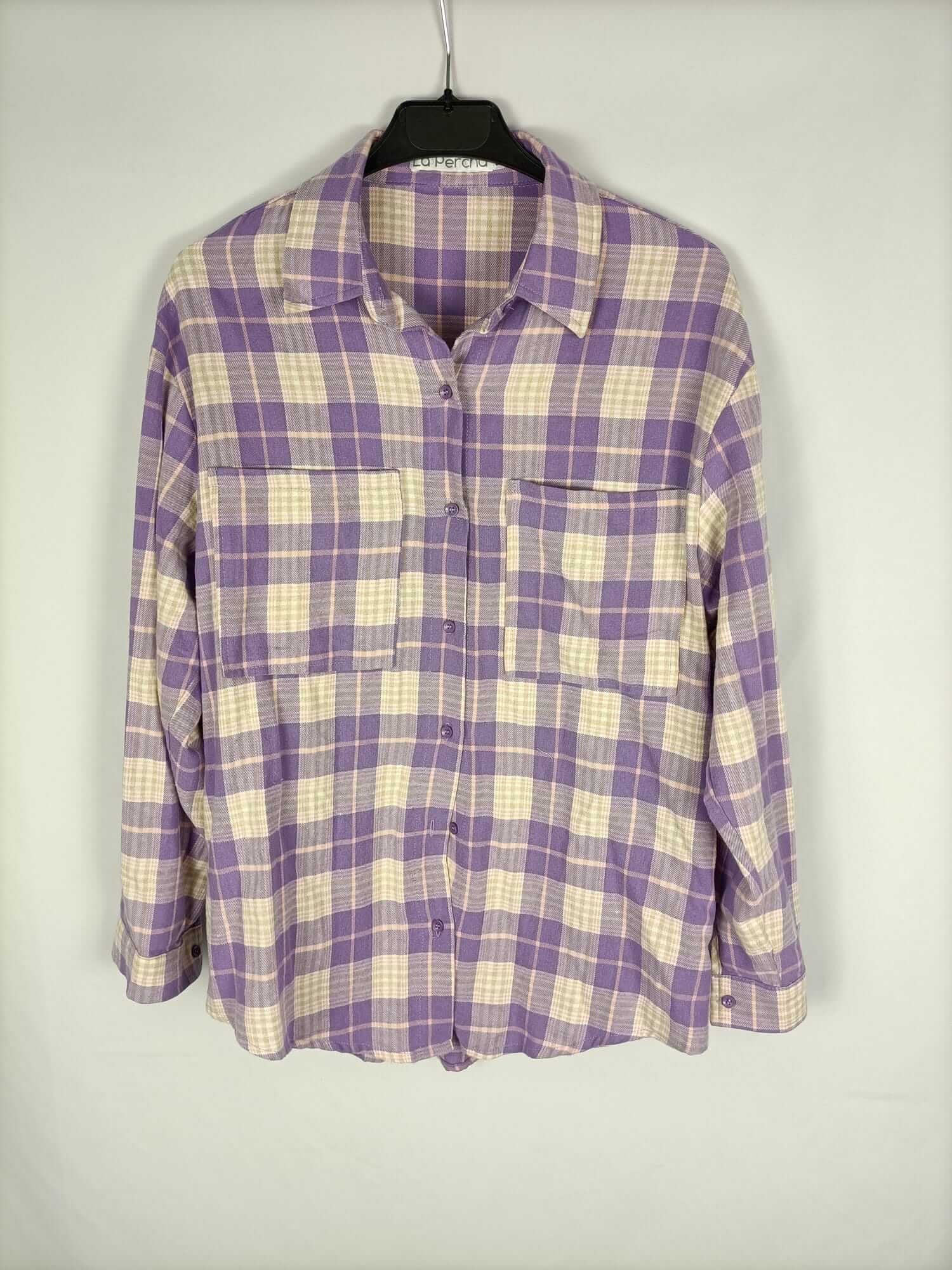 La percha. Camisa de cuadros lila y beige abotonada y de tejido tipo franela. Esto oversized. No Elástica. De sisa a sisa 53 cm largo 77 cm