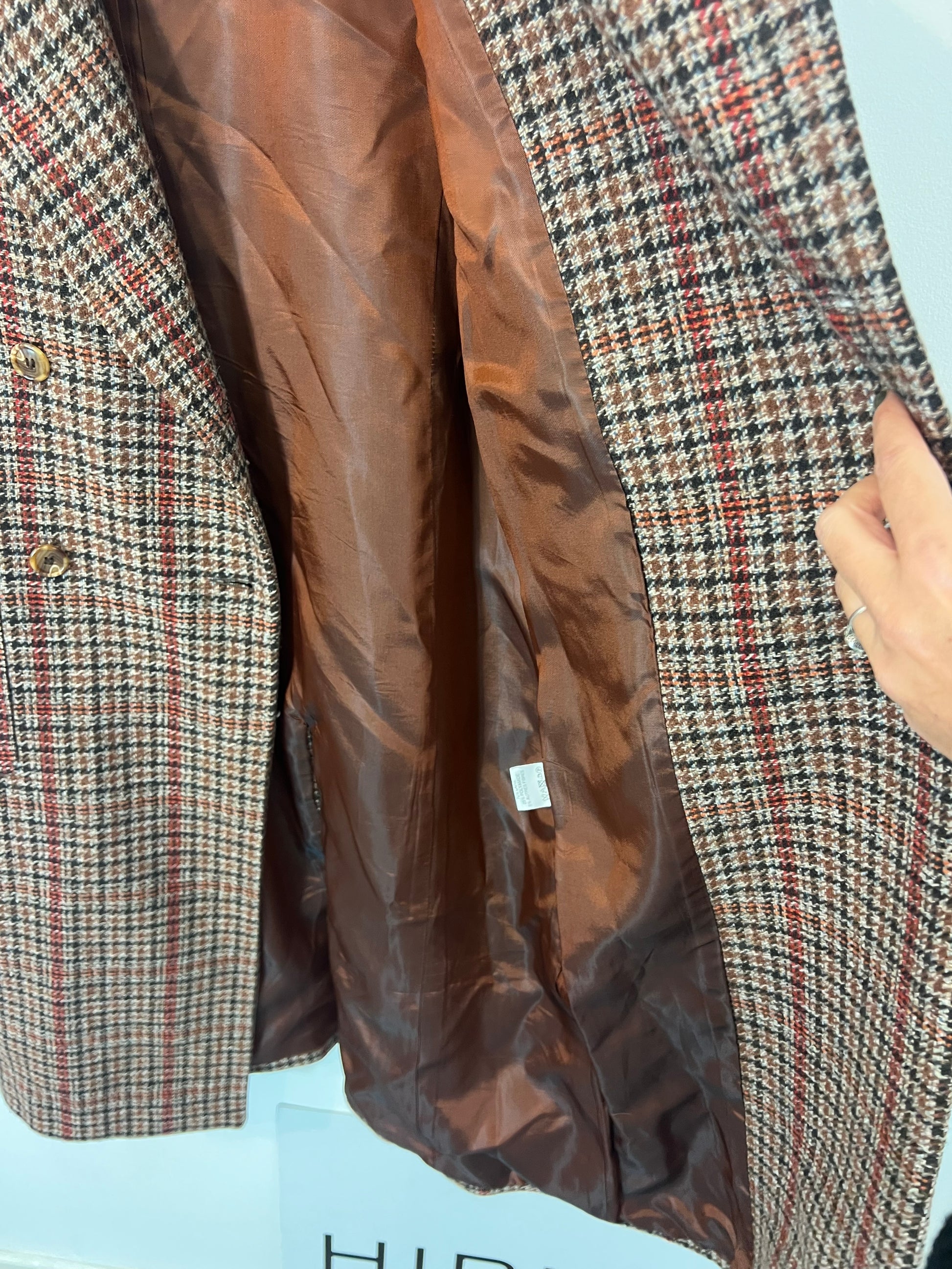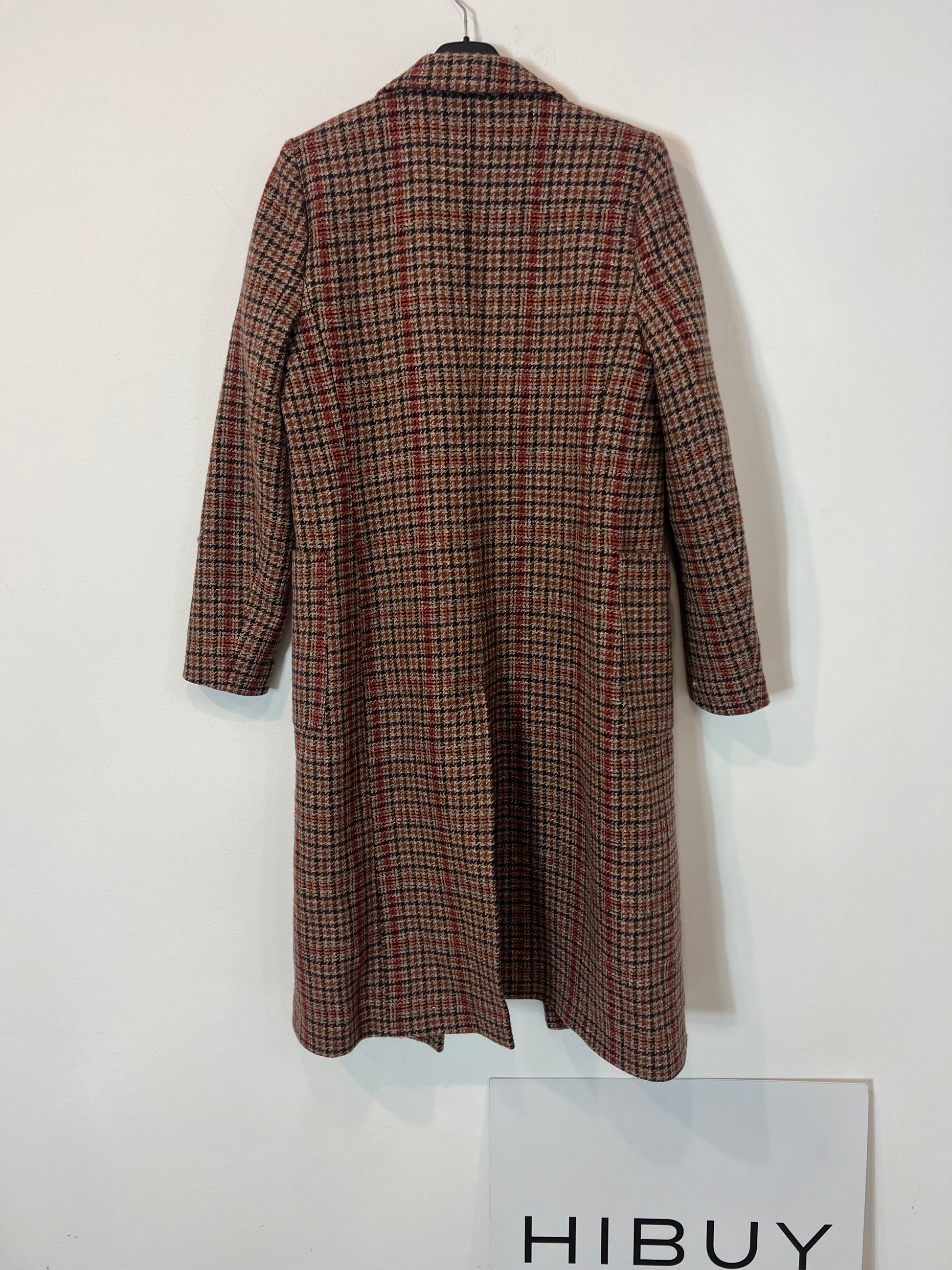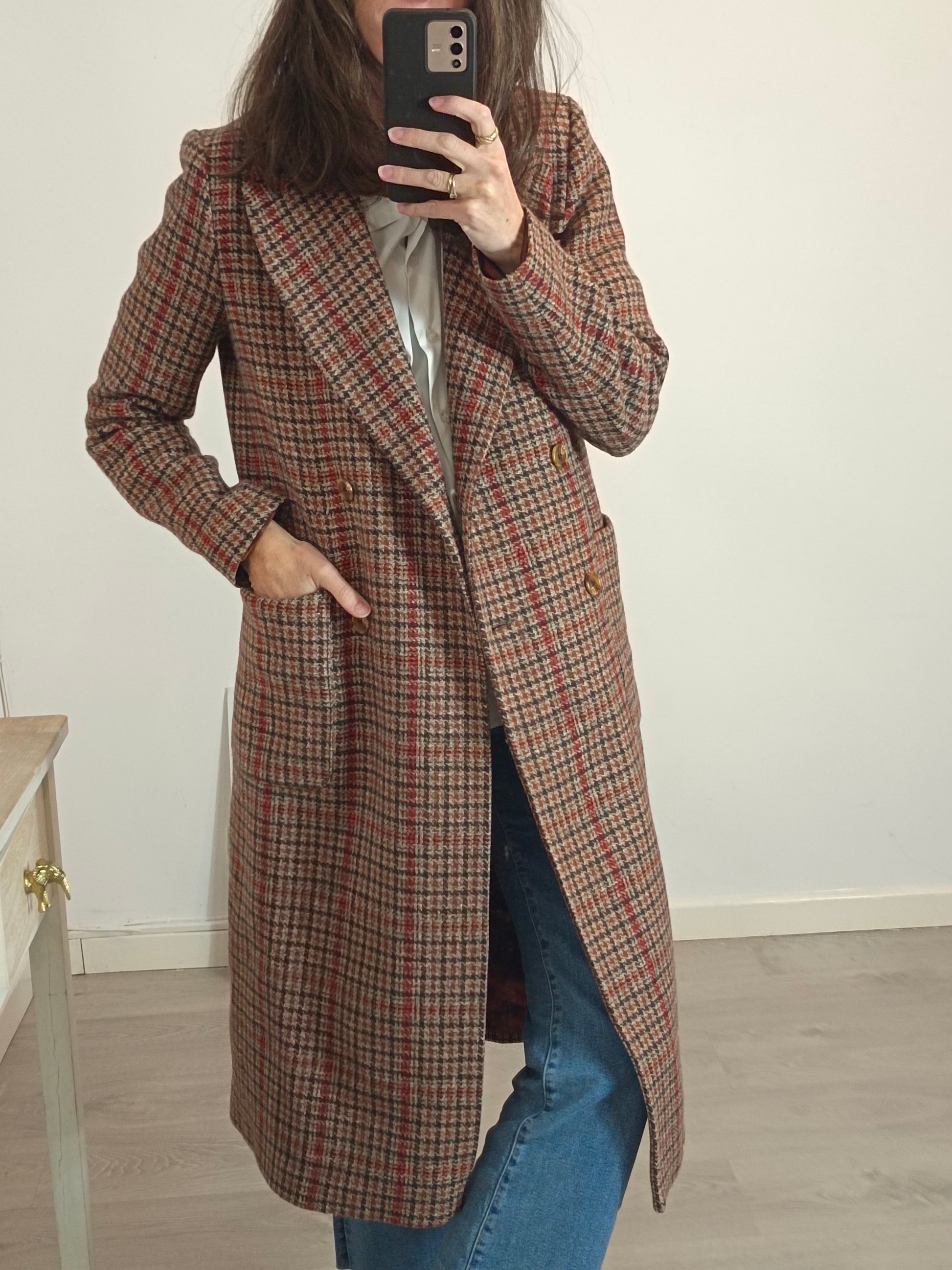 Abrigo largo con lana cuadros tonos marones. hombros 38cm, de sisa a sisa 46cm, largo 106cm