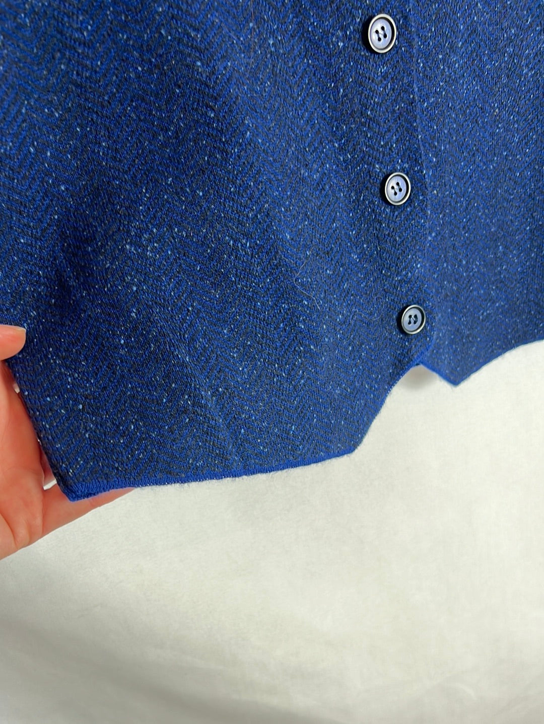 Chaleco azul jaspeado lana, acrílico y seda. De sisa a sisa 45cm, largo 49cm