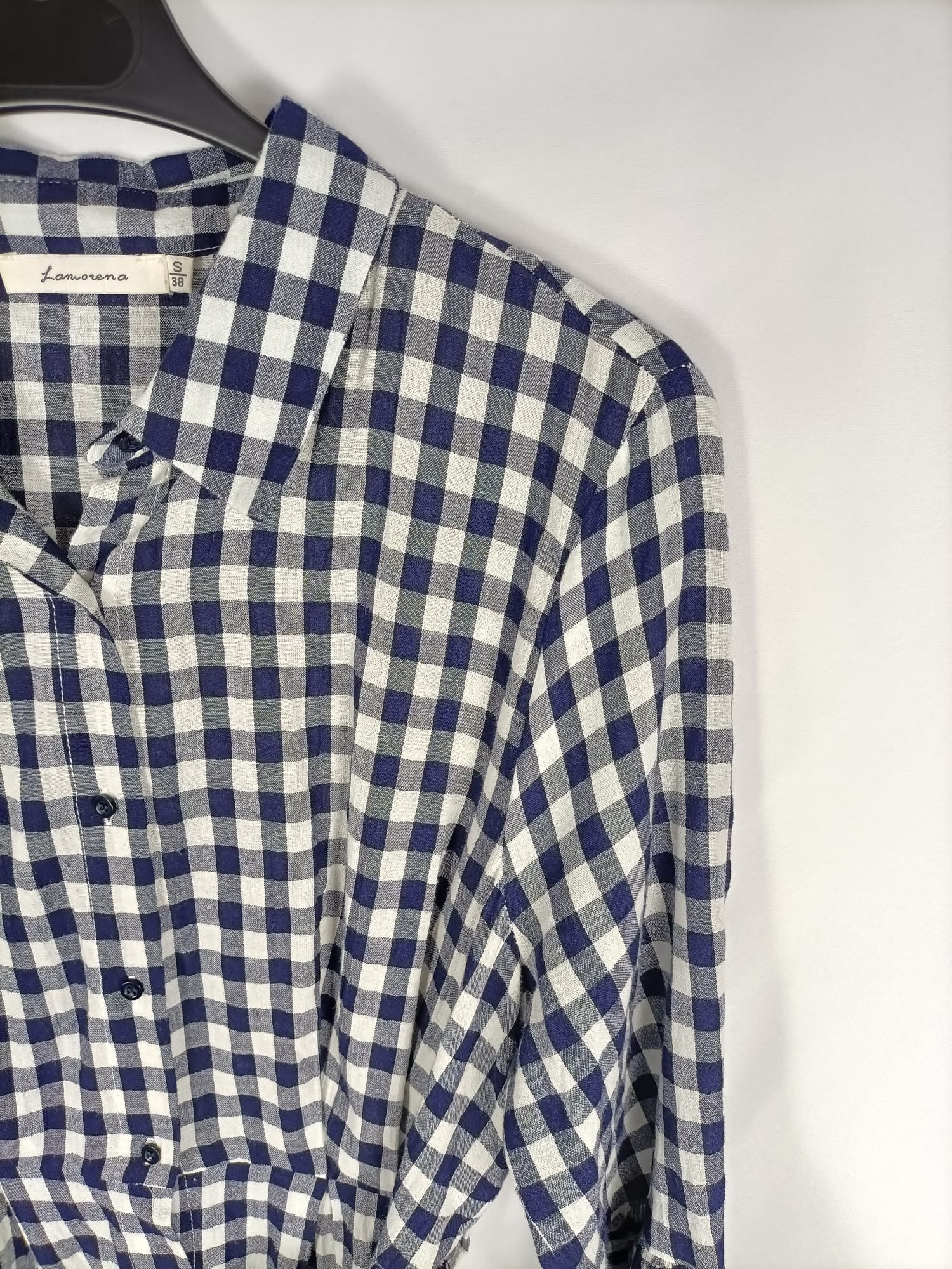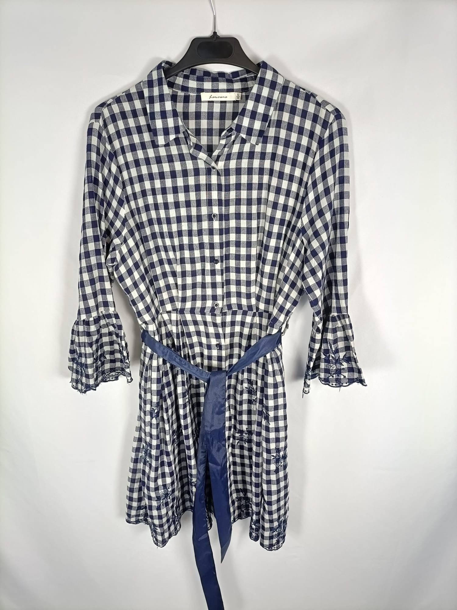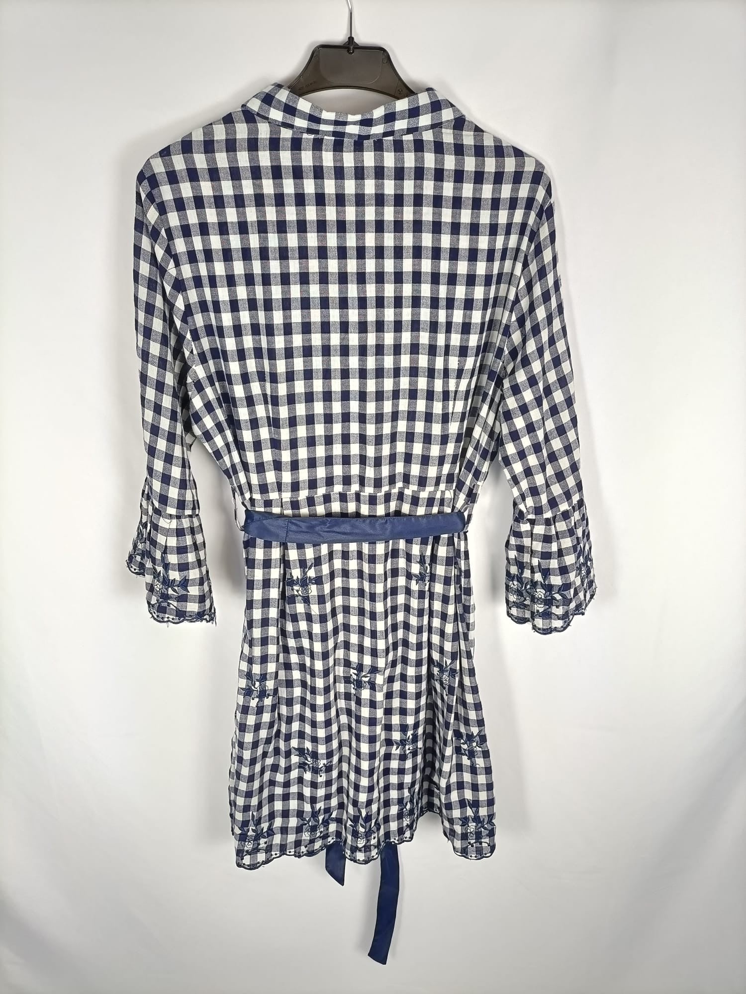 La morena. S. Vestido de cuadros azul blanco roto camisero con detalles bordados en mangas y parte de abajo. Manga 3/4 con volante. No elástico. De sisa a sisa 51 cm largo 91 cm