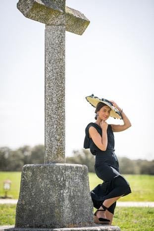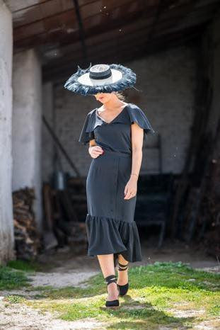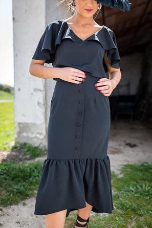 Top de crepe en negro, escote en pico tanto en la parte delantera como trasera, con volante estilo capa en mangas y escote.