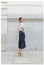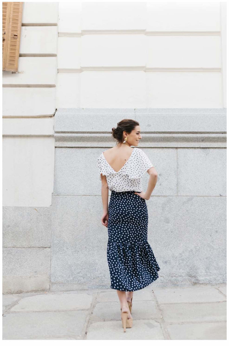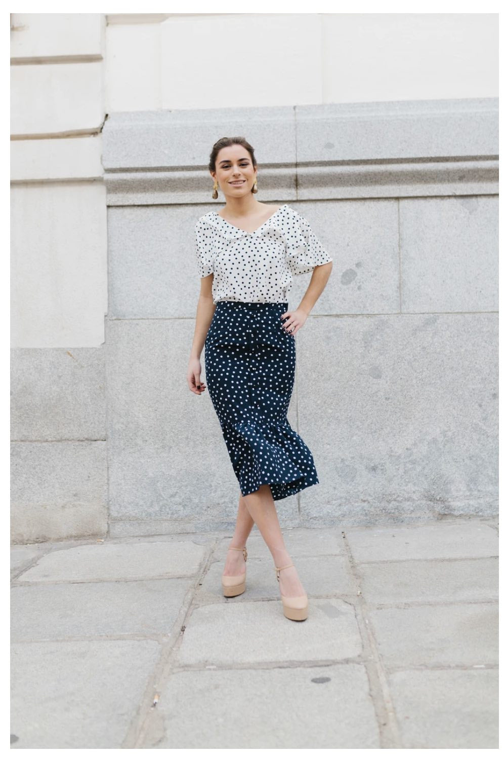 Top de crepe en fondo blanco con lunares azul marino, escote en pico tanto en la parte delantera como trasera, con volante estilo capa en mangas y escote.