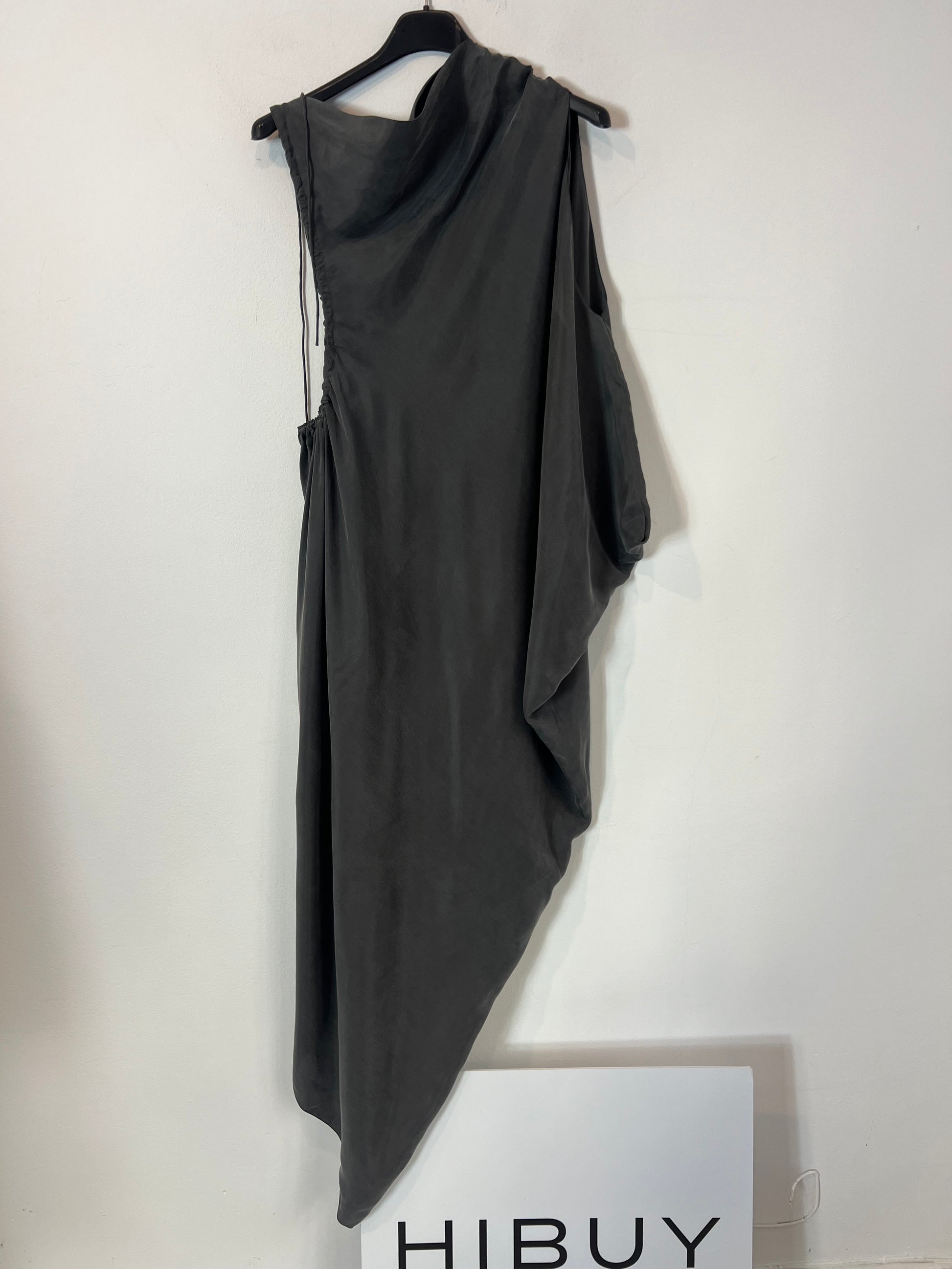 Vestido gris midi con mangas y escote asimétrico. No elástico. largo 135 cm