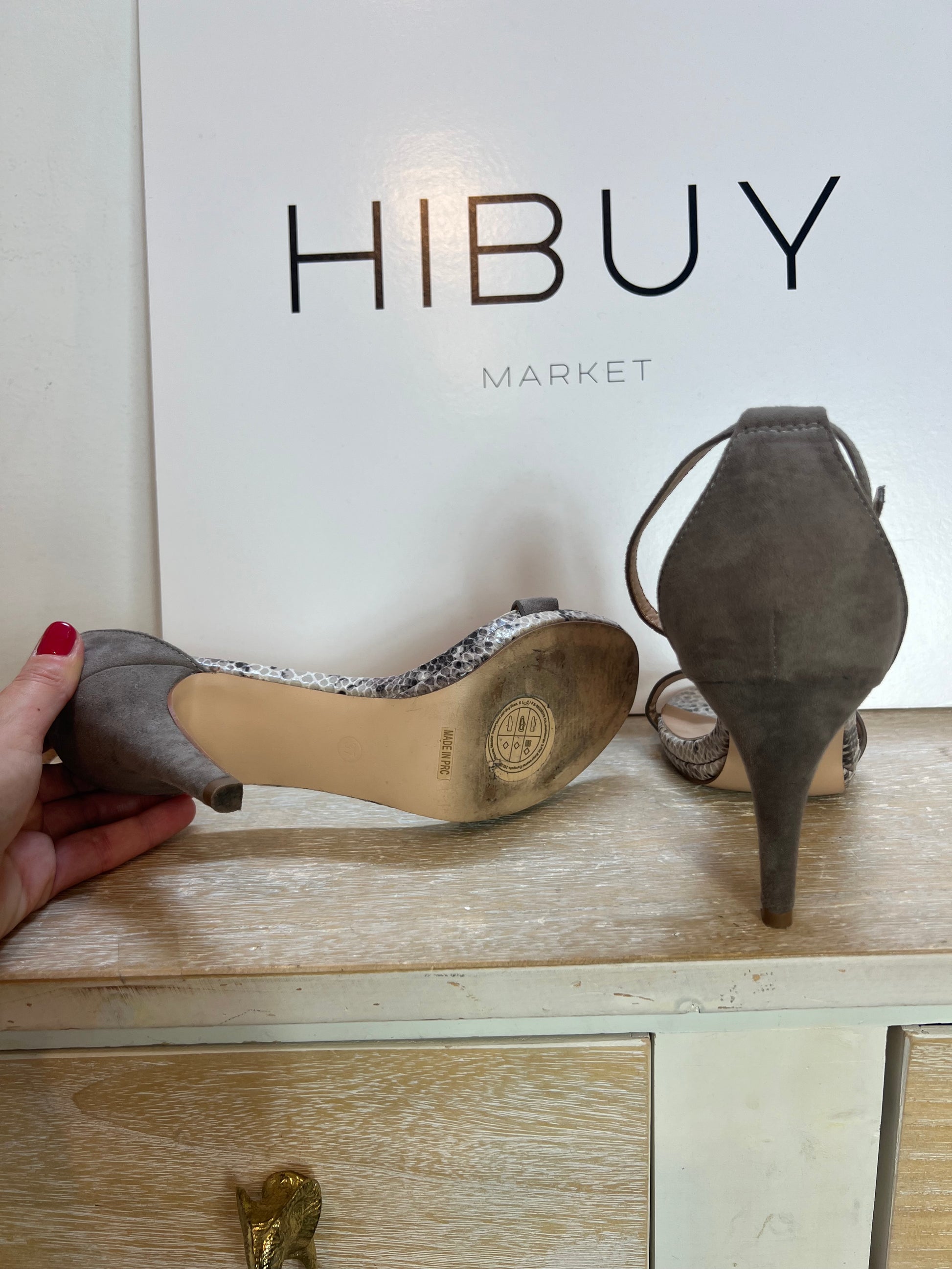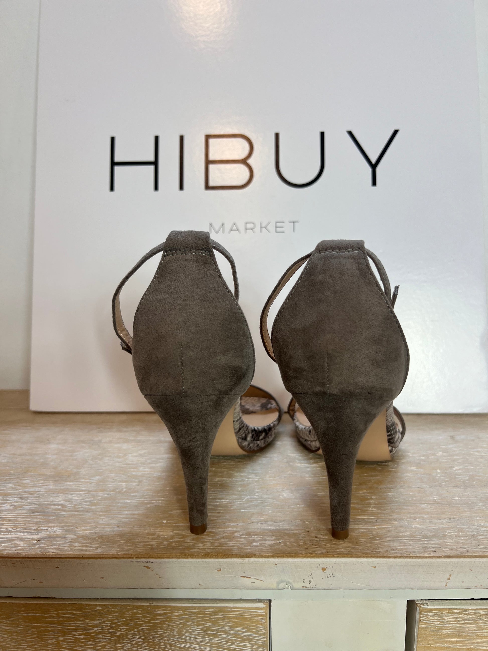 Sandalia gris con detalles animal print. Tacón 9cm