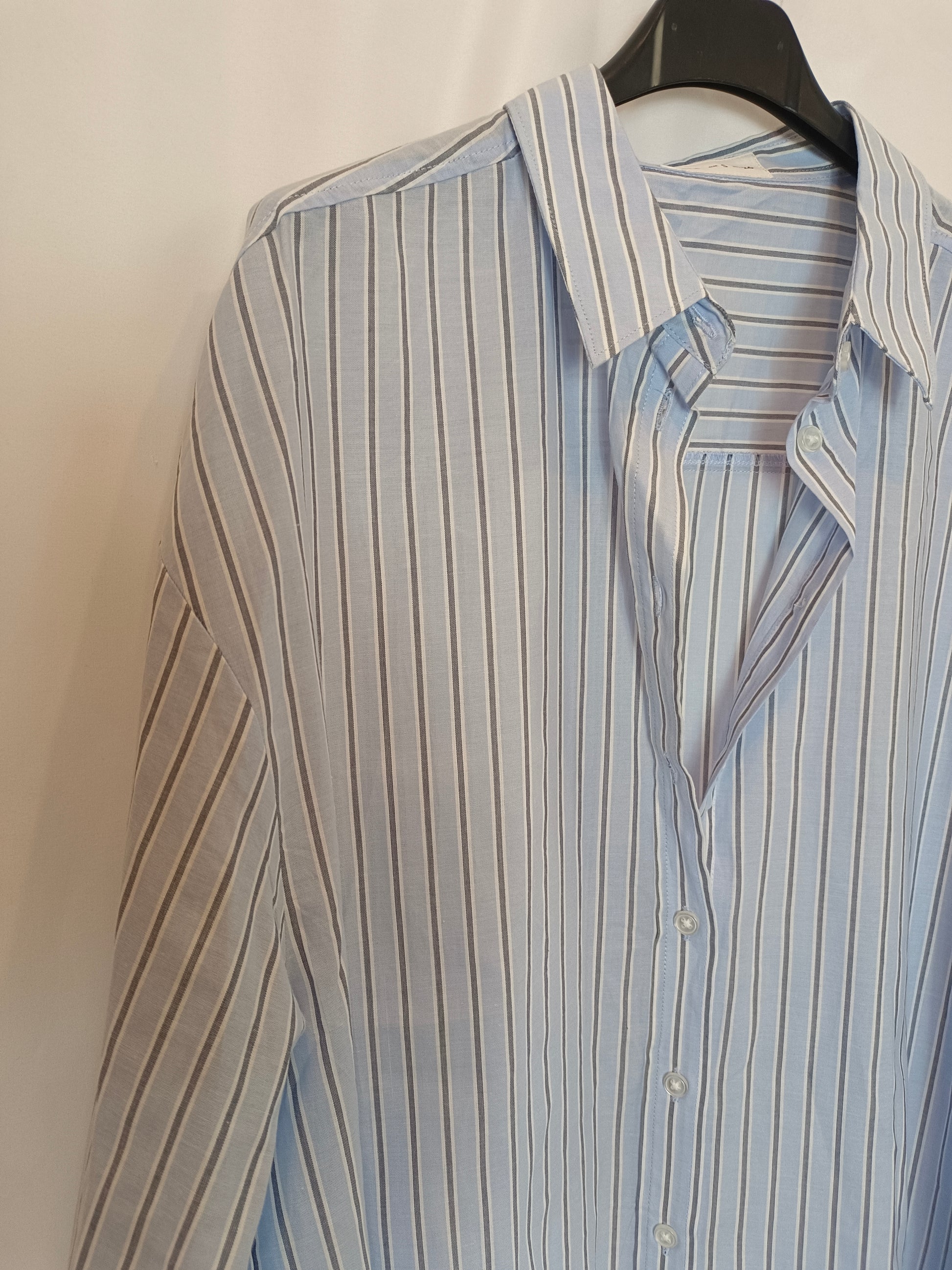 blusa fluida oversized azul claro con rayas blancas. Espalda 52 cm largo 65 cm