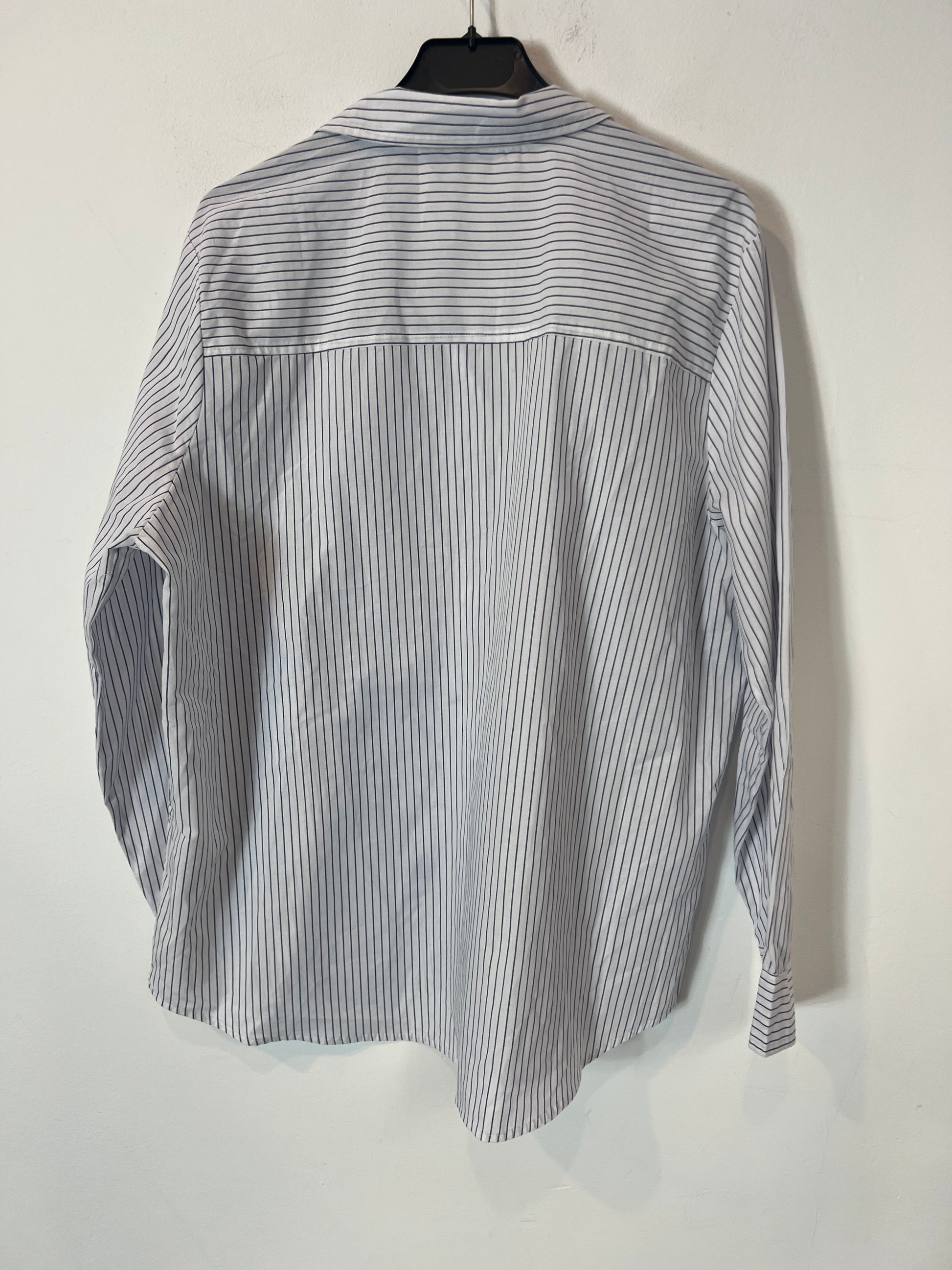 camisa blanca con rayas grises. Abotonada. No elástica.espalda 56cm, largo 73cm