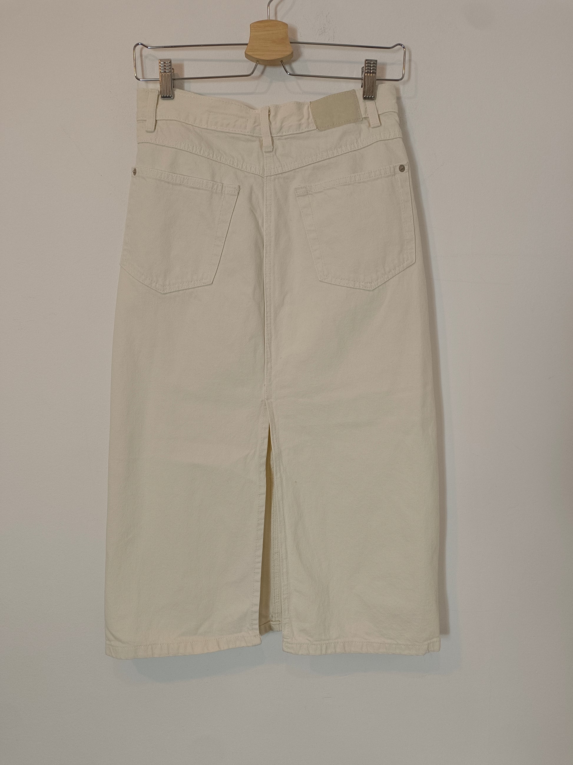 falda midi denim beige con detalles de abertura trasera. No elástica.