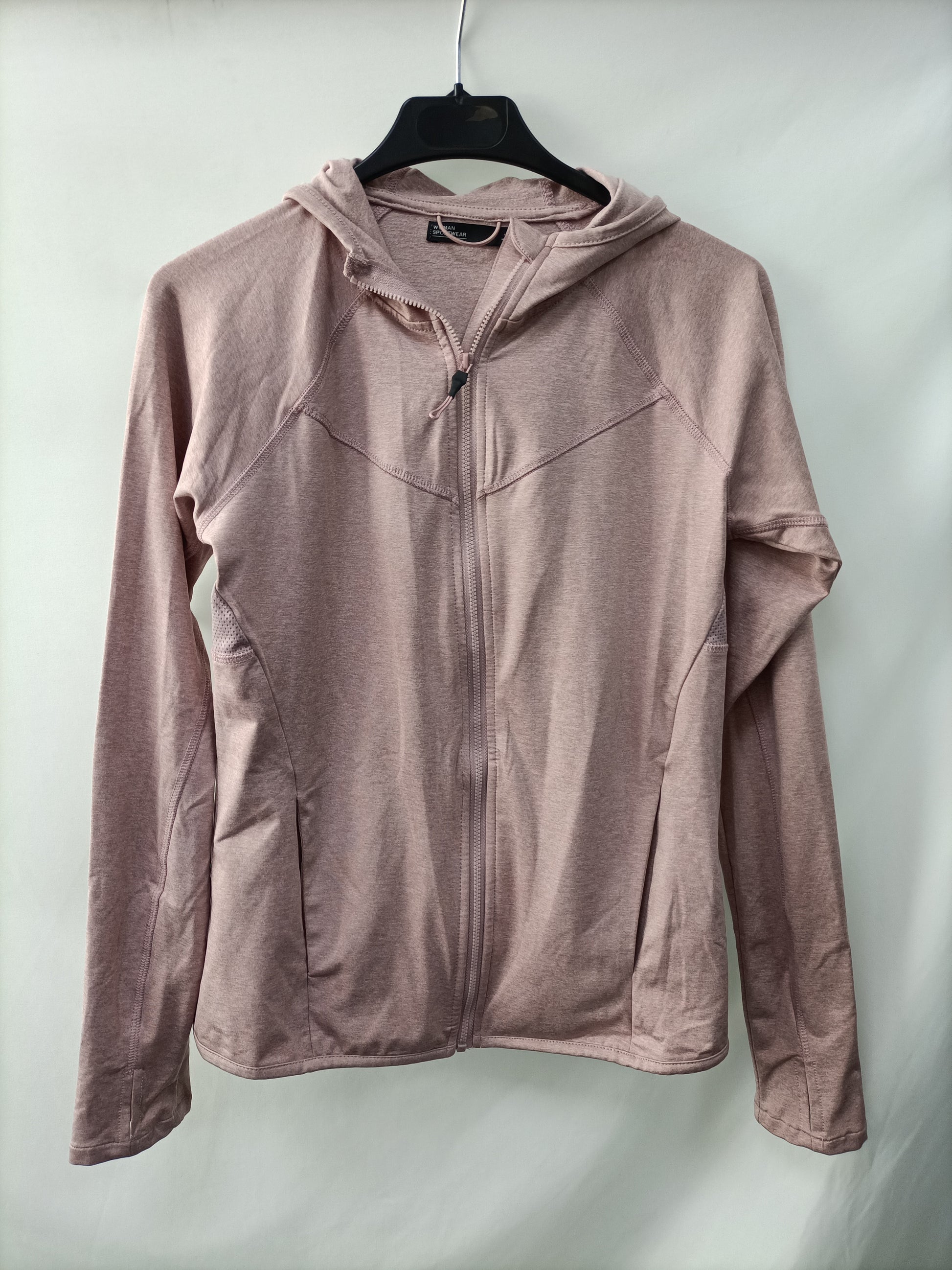 Sudadera rosa jaspeada capucha. Largo 57 cm