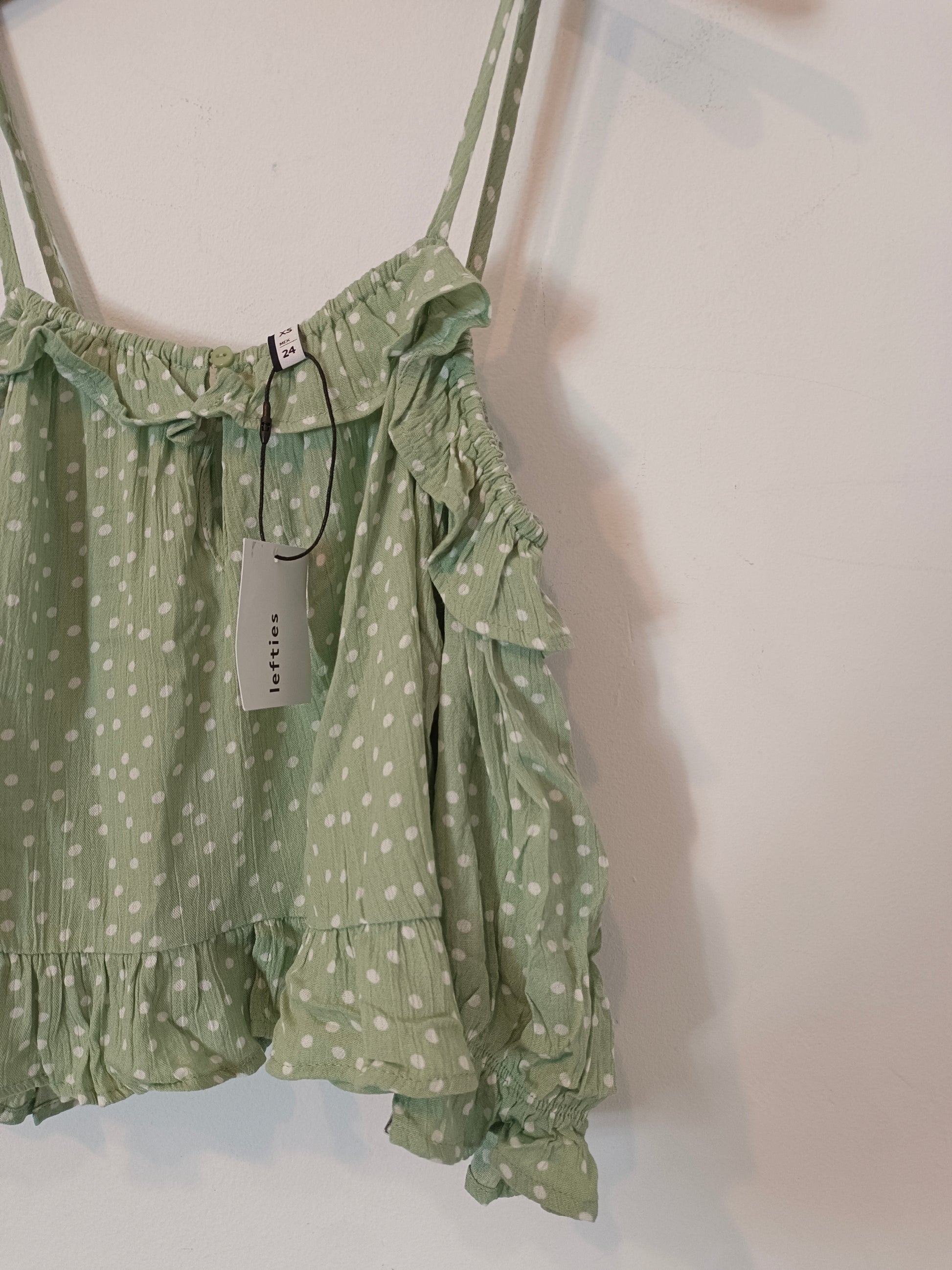 NUEVO CON ETIQUETA. top ver con lunares blancos. detalle de mini volante. De sisa a sisa cm, largo cm