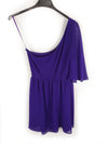 Vestido morado asimétrico con cintura elástica. Es fluido. Largo 80 cm