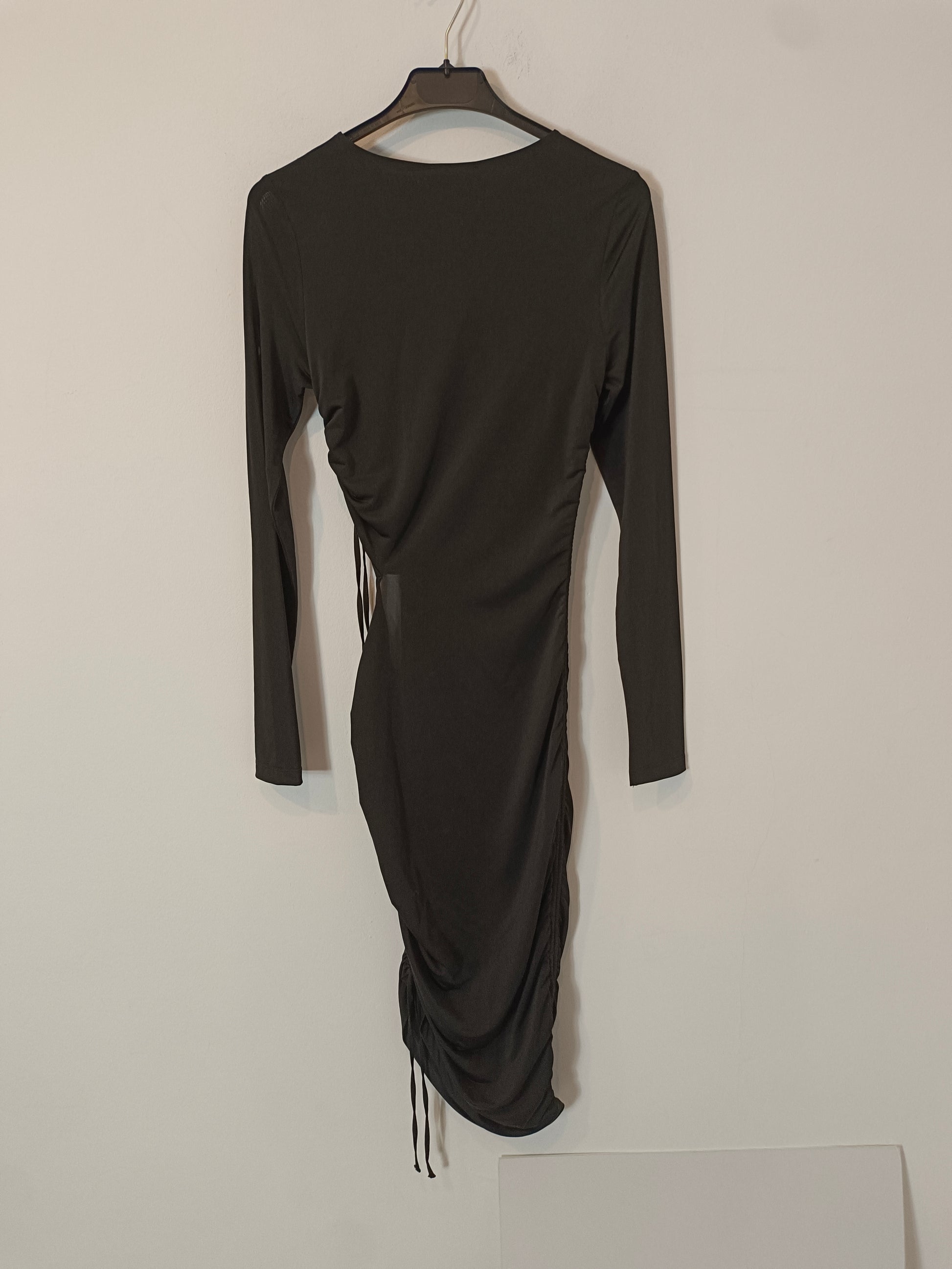 NUEVO CON ETIQUETA. Vestido entallado negro con detalles fruncidos. largo 107 cm