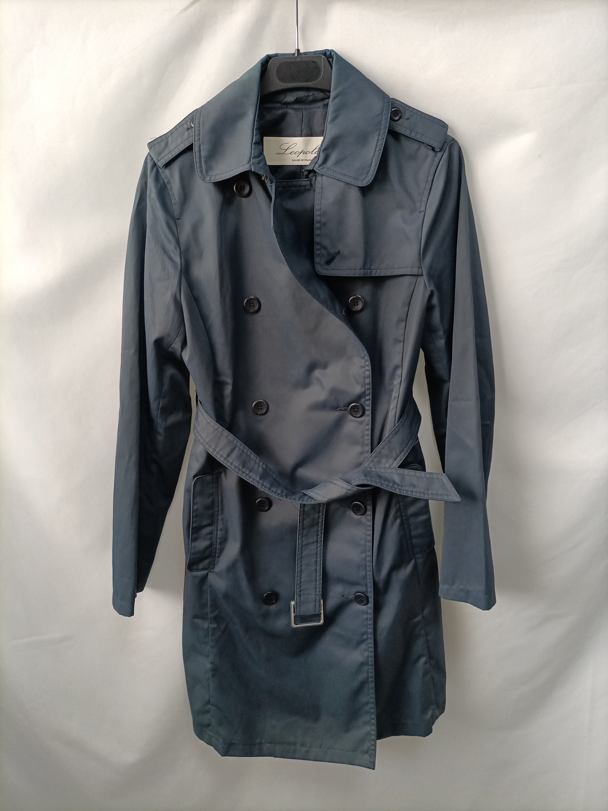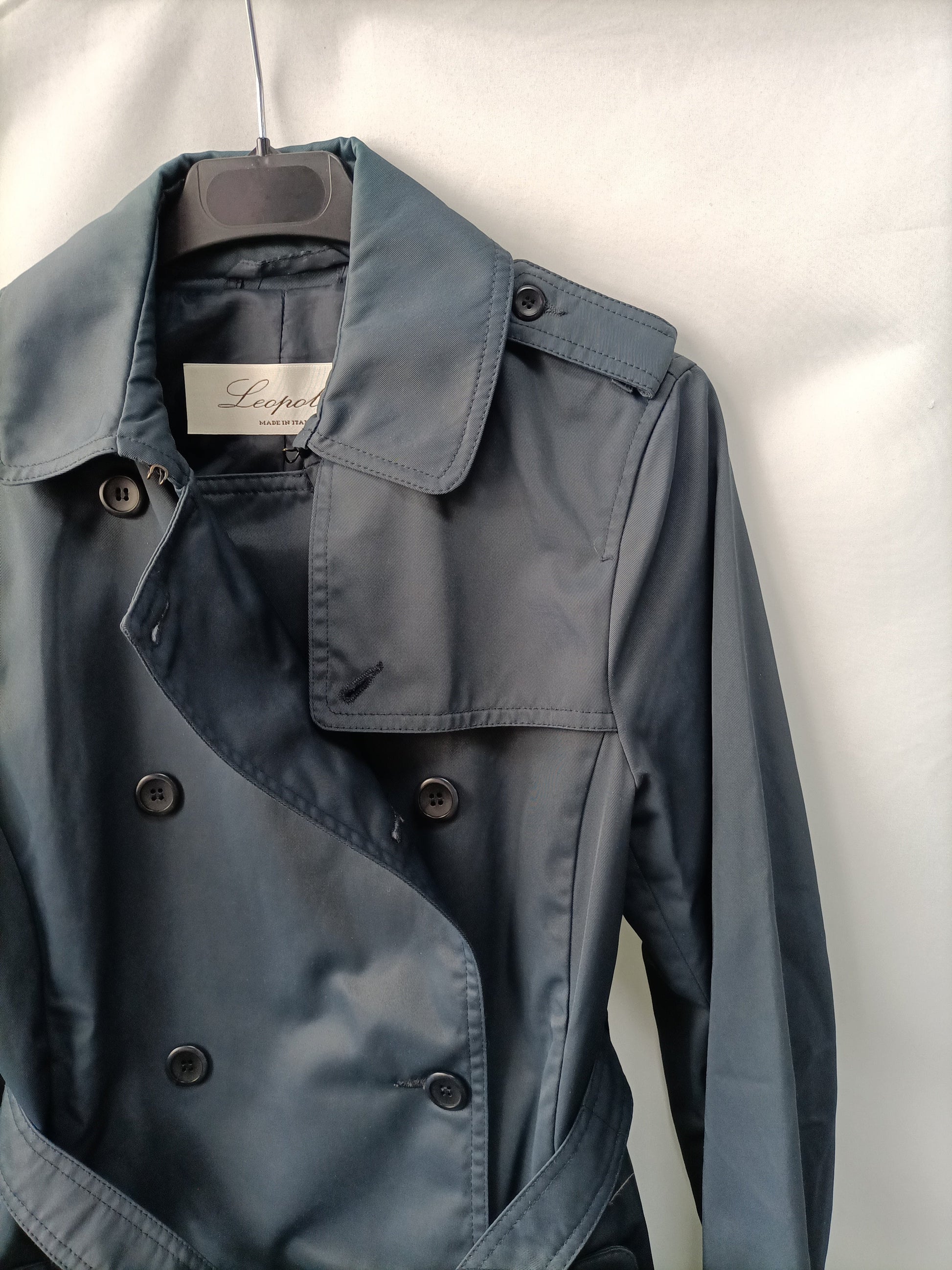 Gabardina azul de tejido impermeable cruzada con Cinturón. No elástica. De sisa a sisa 45 cm Largo 103 cm