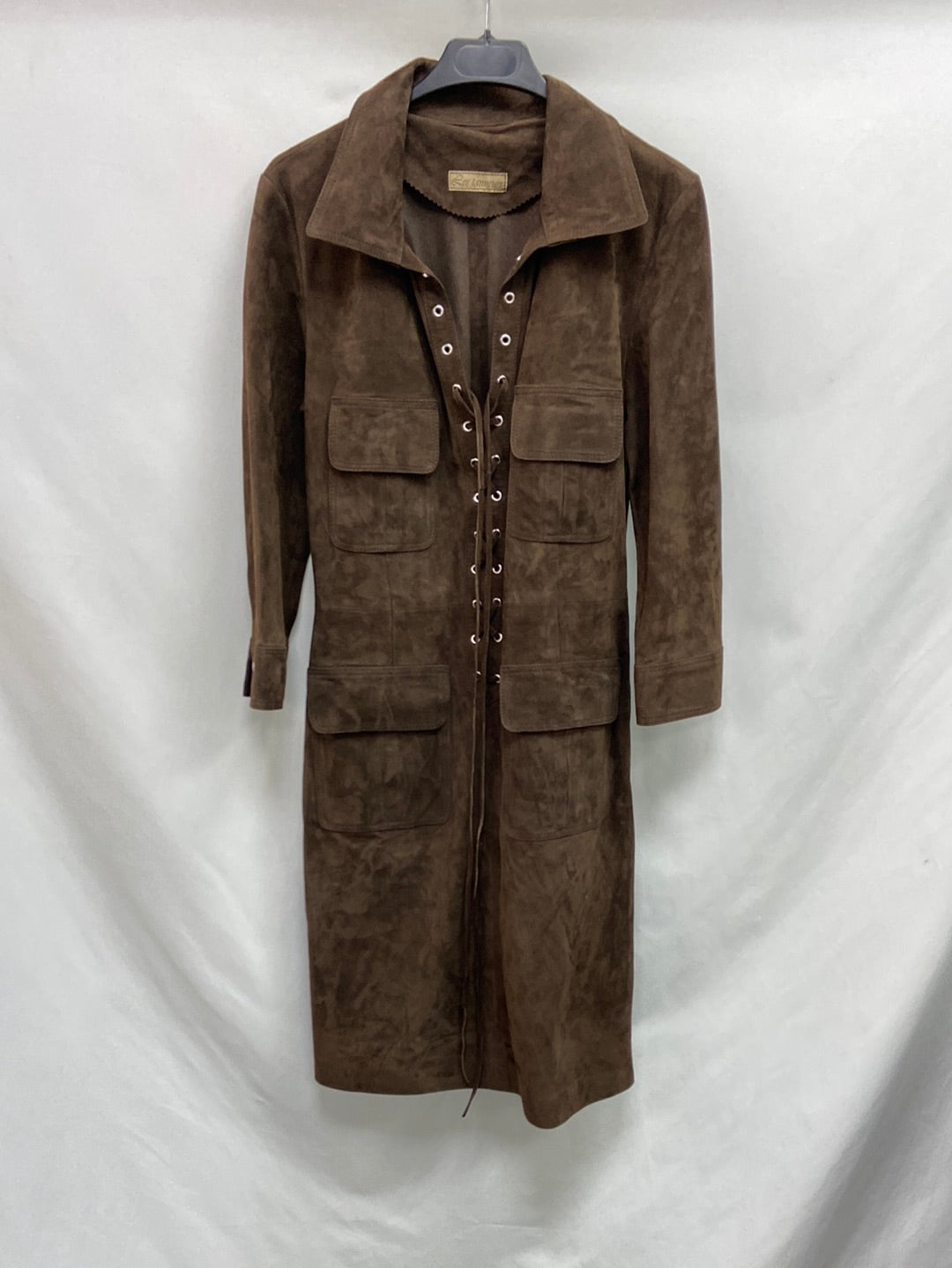 Vestido midi de ante marrón, mangas 3/4, detalle de cuerdas en el escote.. de sisa a sisa 43 cm largo 100 cm