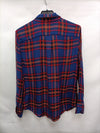 Camisa azul marino de cuadros naranjas y rojos