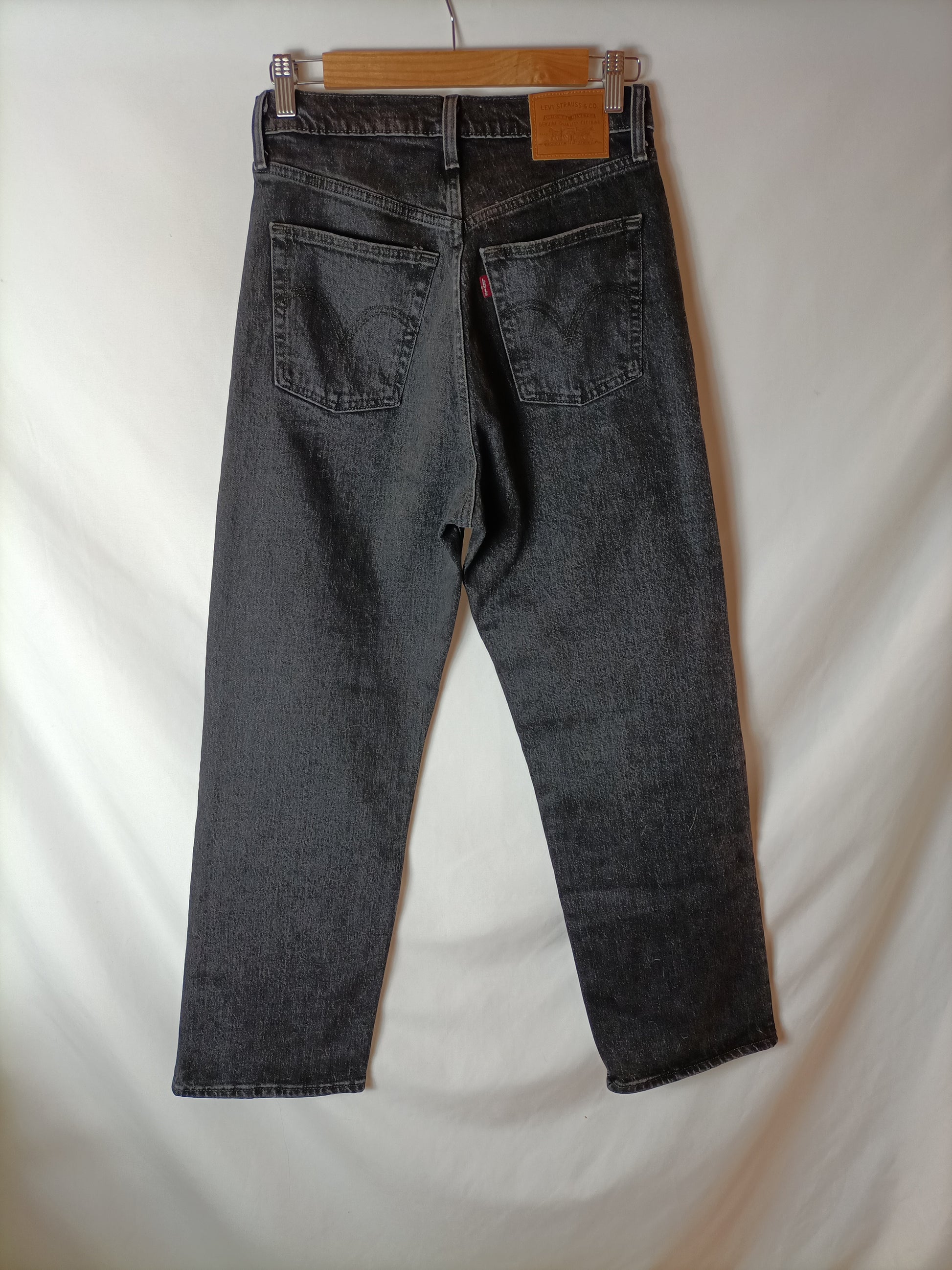 Denim recto abotonado color negro desgastado. Pata ancha y cintura alta.