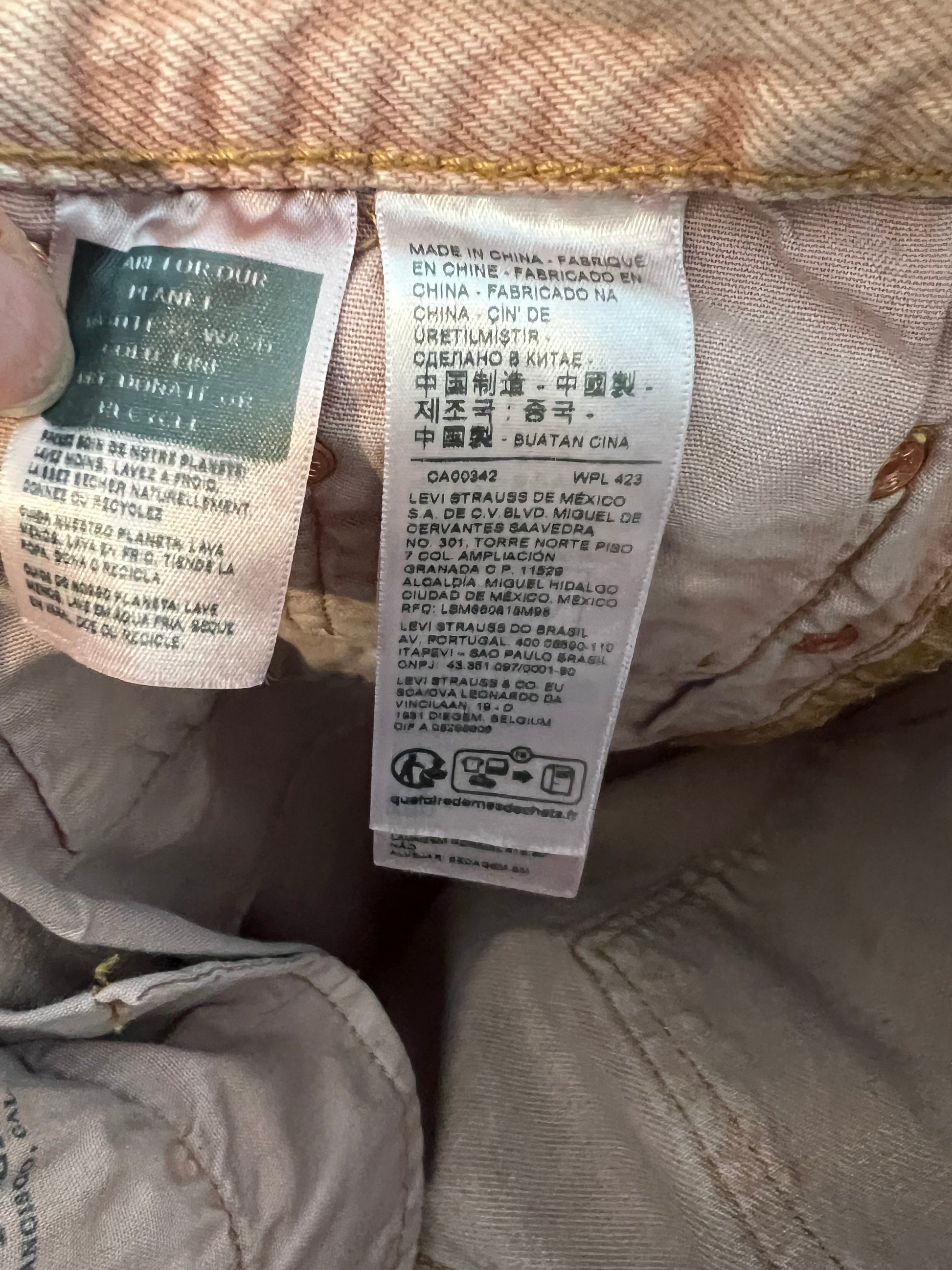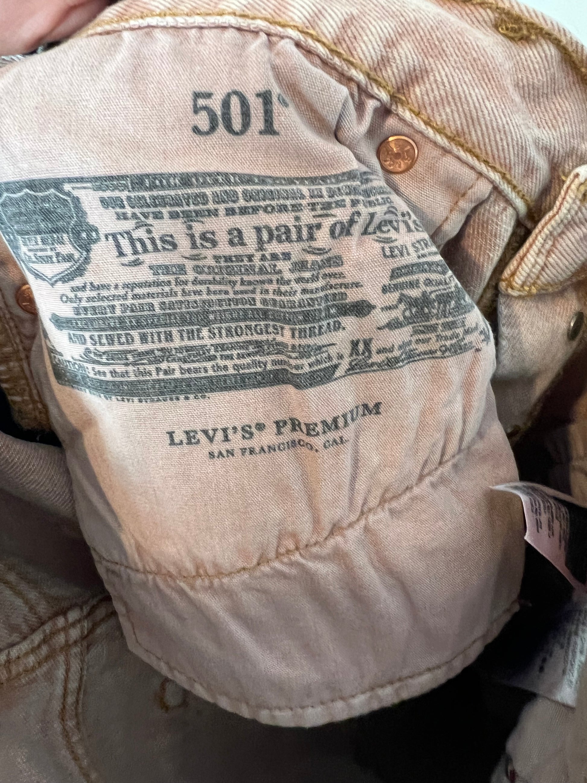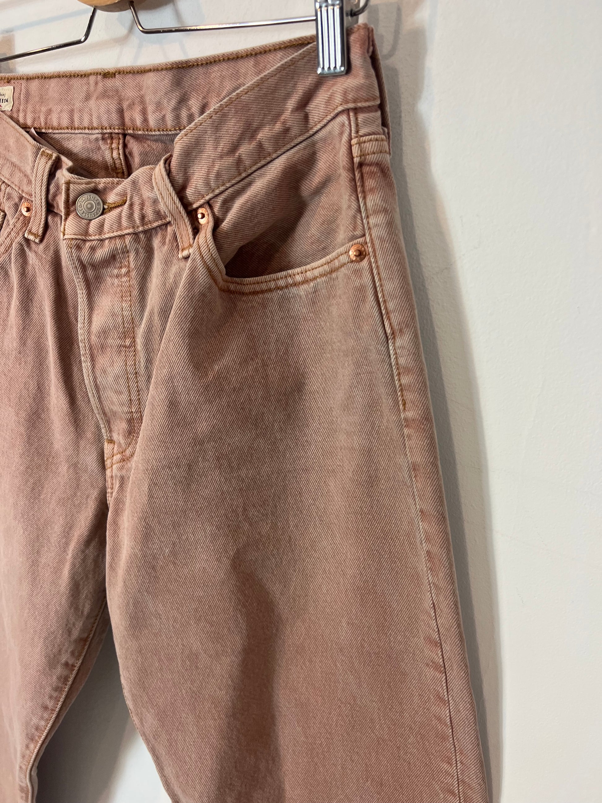 Pantalón denim rosa palo. No elástico. modelos 501. Se abrocha con botones. Cibtura 38cm, largo 109cn