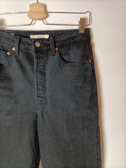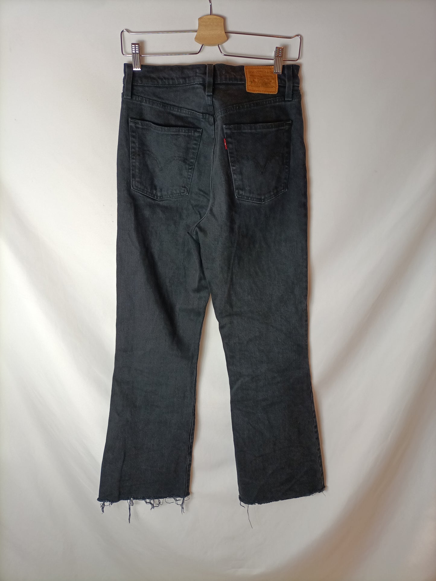 Pantalón recto denim negro, se abrocha con botones. Cintura 36 cm
