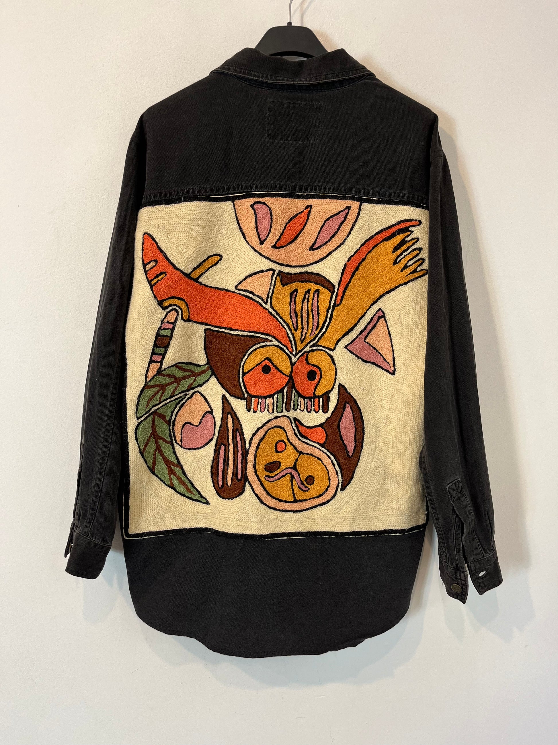 sobrecamisa/chaqueta fluida denim negro con detalle bordado en la espalda. De sisa a sisa 55 cm, largo 76 cm.