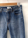 Jeans rectos azul oscuro semielasticos. Bajos deshilachados. Cintura 34-36 largo 97 cm
