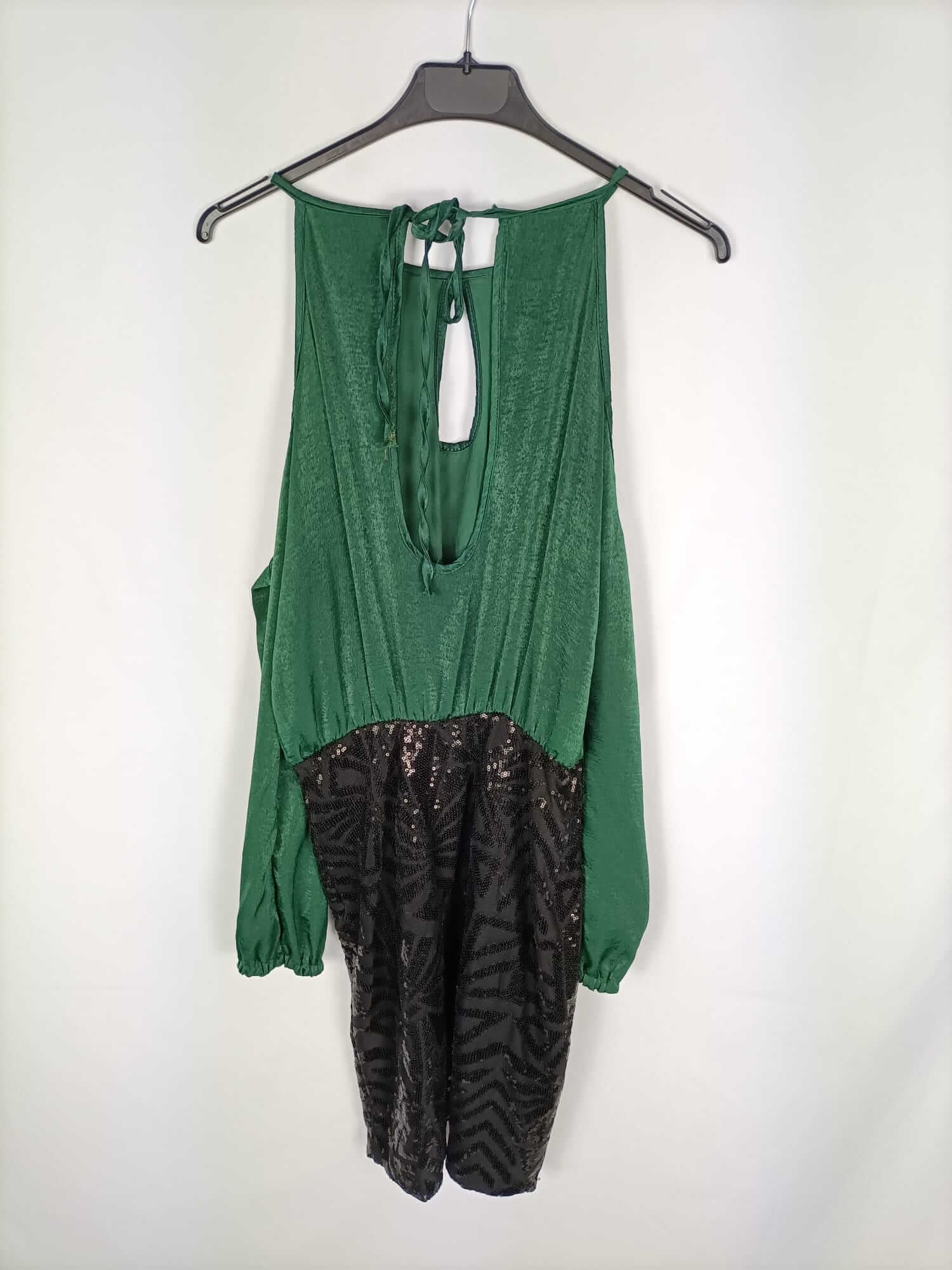 Lima limón. NUEVO CON ETIQUETA. Vestido doble textura parte de arriba tipo blusa con tirantes y mangas al aire y falda negra de lentejuelas ajustada. De sisa a sisa 50 cm largo 93 cm