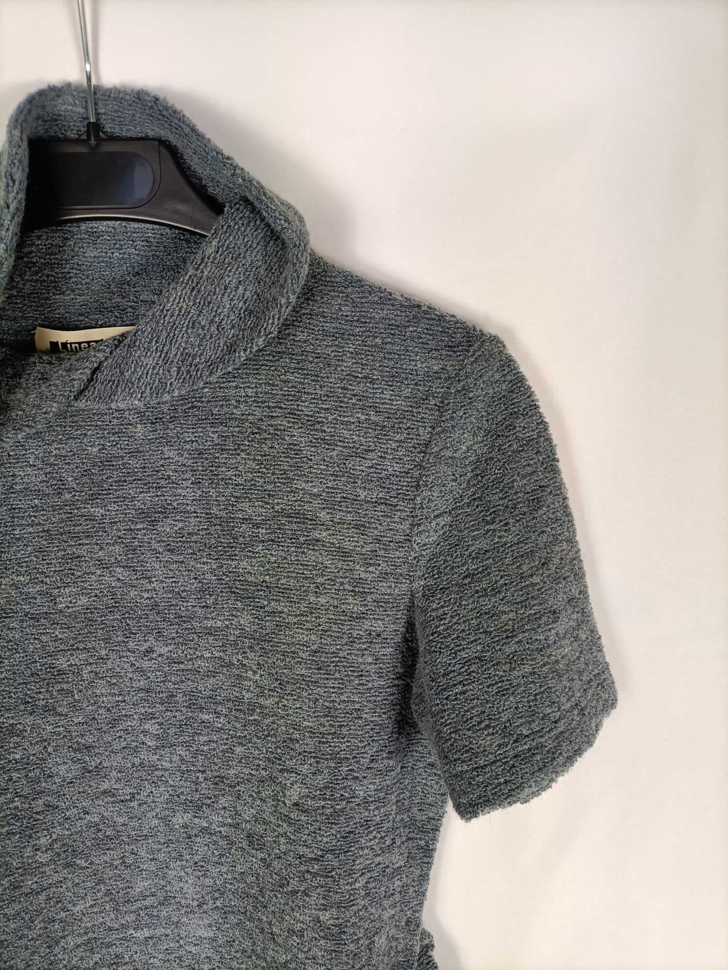 Línea klub. Tu. Top gris de tejido con textura. Cuello perkins y elastico. Cinturón estilo lazada. Largo 60 cm
