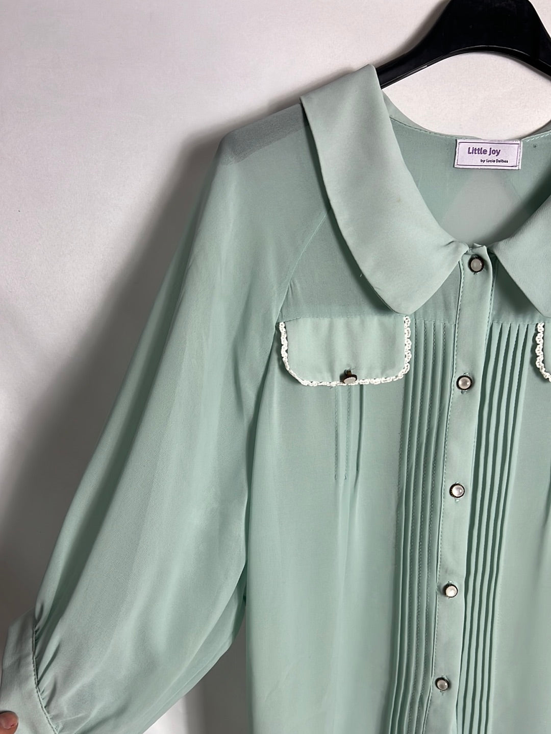 LITTLE JOY. Blusa azul claro semitransparente estilo vintage . T S (Tara)