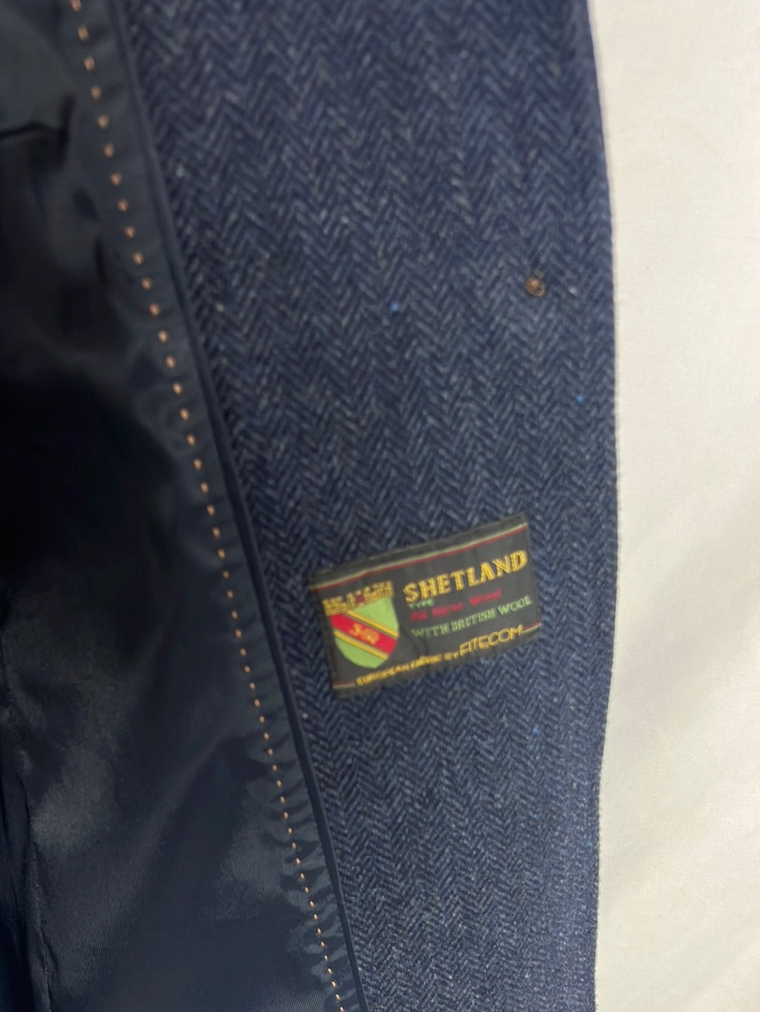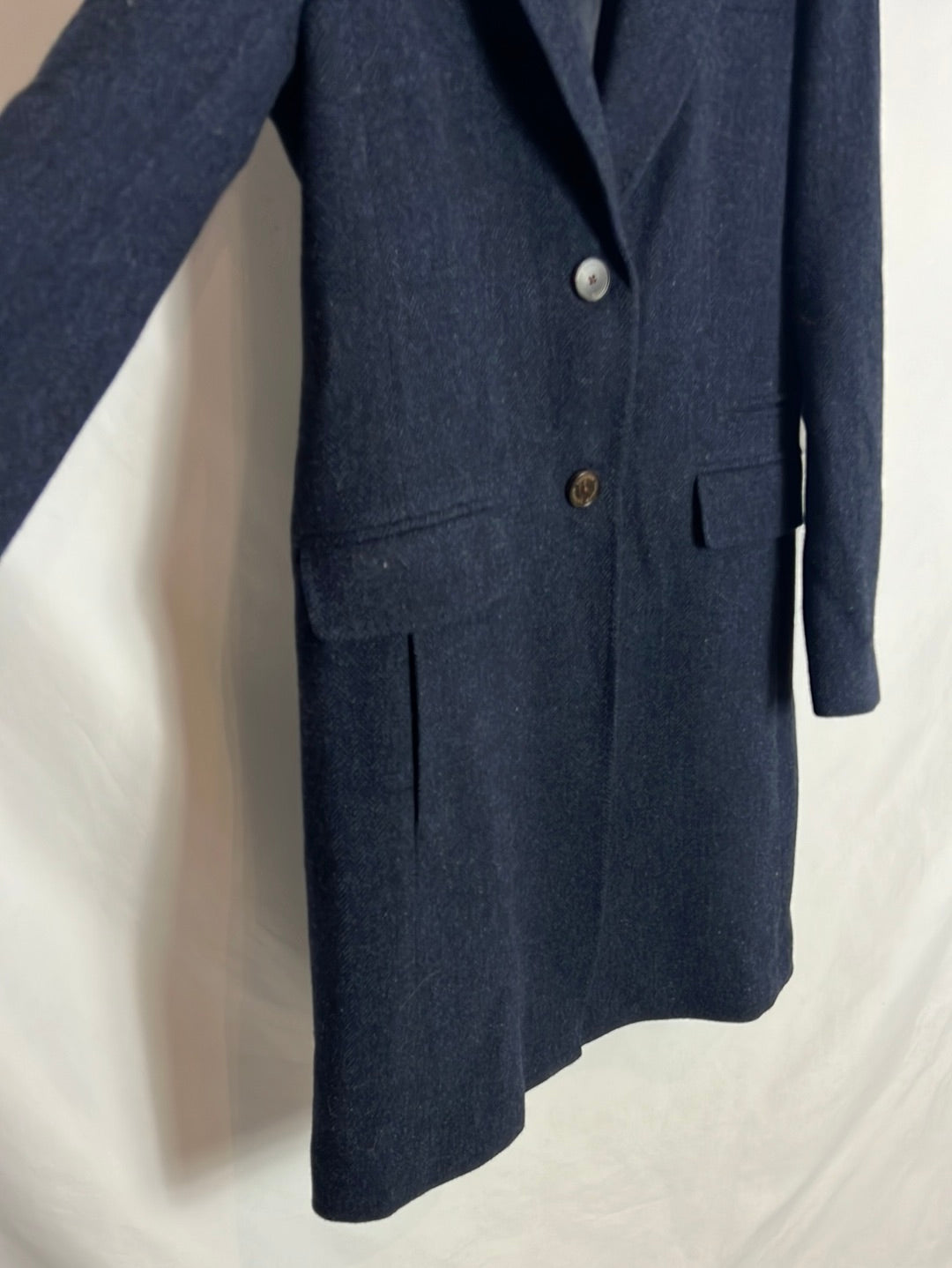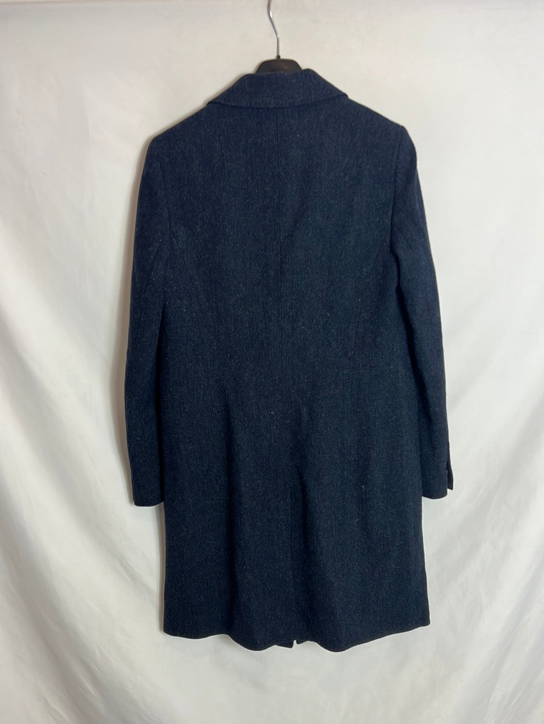 abrigo de paño azul con espiga 100%lana . Hombros 39cm, de sisa a sosa 48cm, largo 96cm