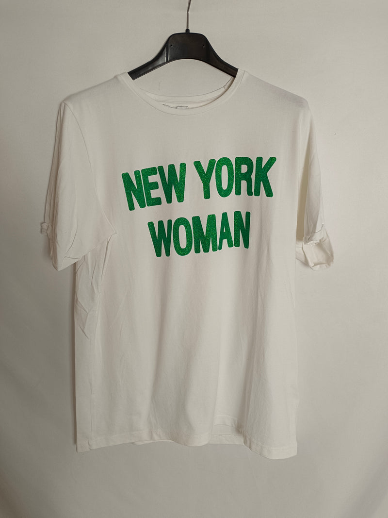 Camiseta blanca "NEW YORK WOMAN" verde de purpurina