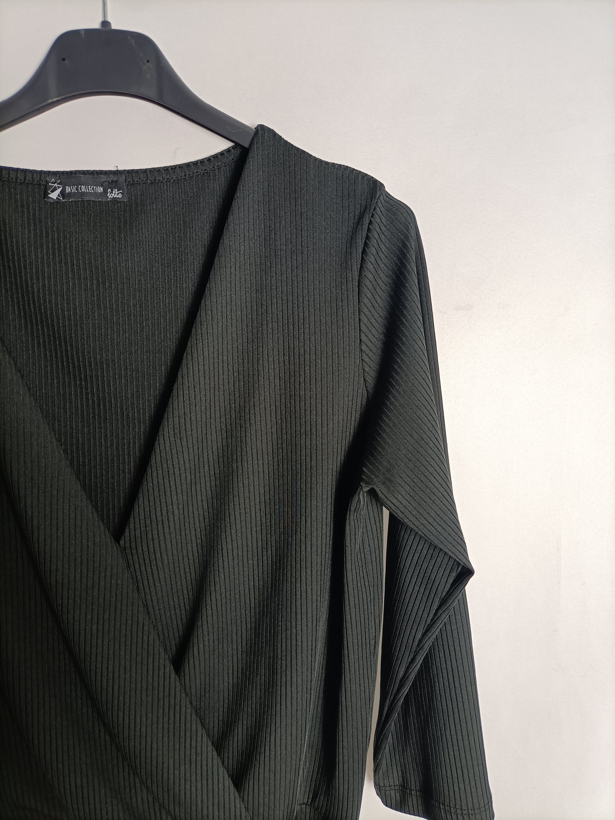 Top cruzado negro de tejido de canalé. Hebilla lateral .Elástico