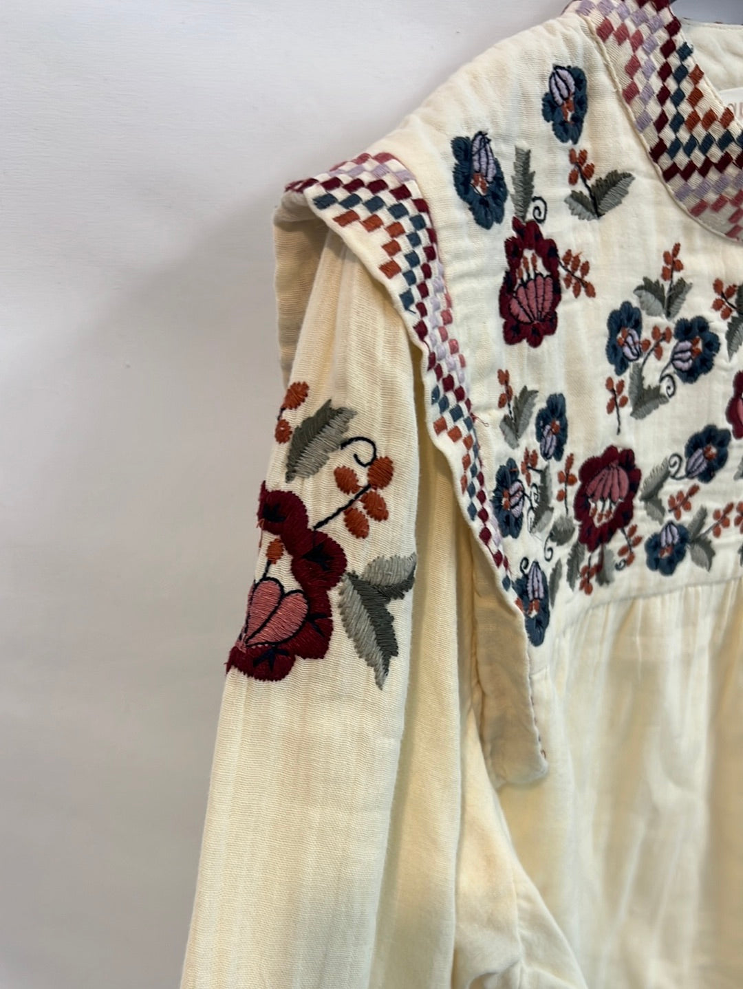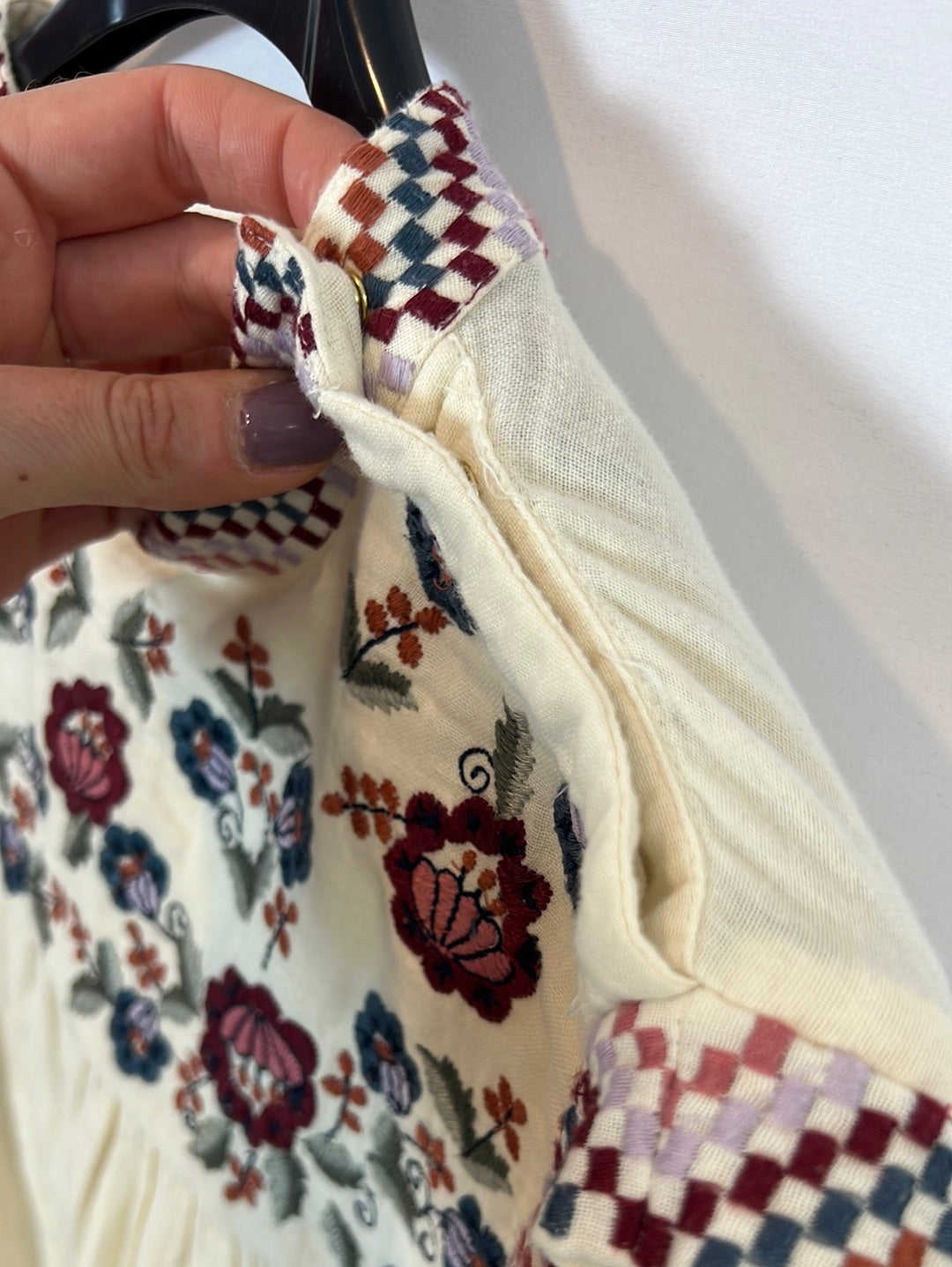 blusa beige fluida con flores bordadas. Hombros 37cm hasta las costuras, de sisa a sisa 59cm, largo 59cm