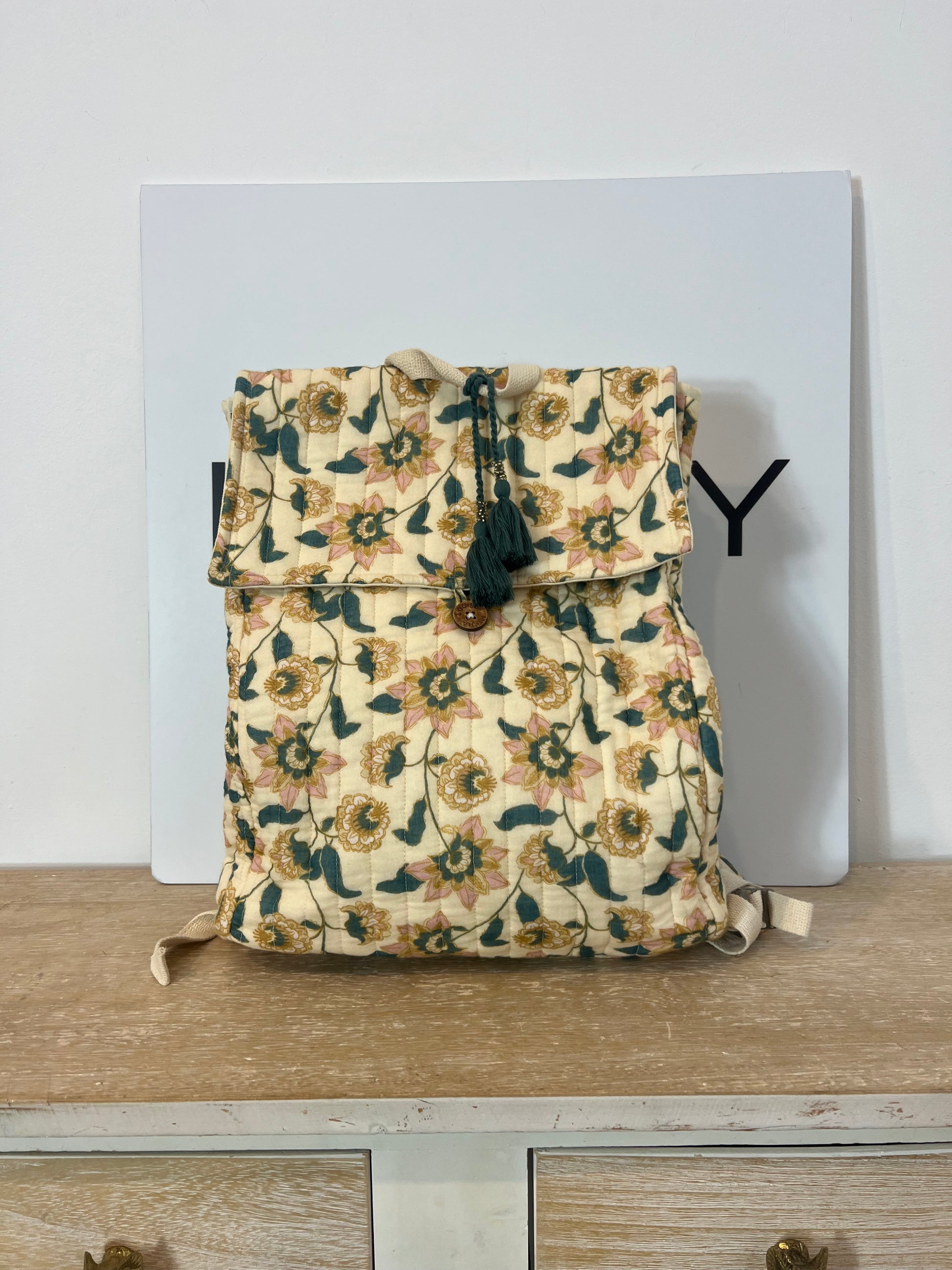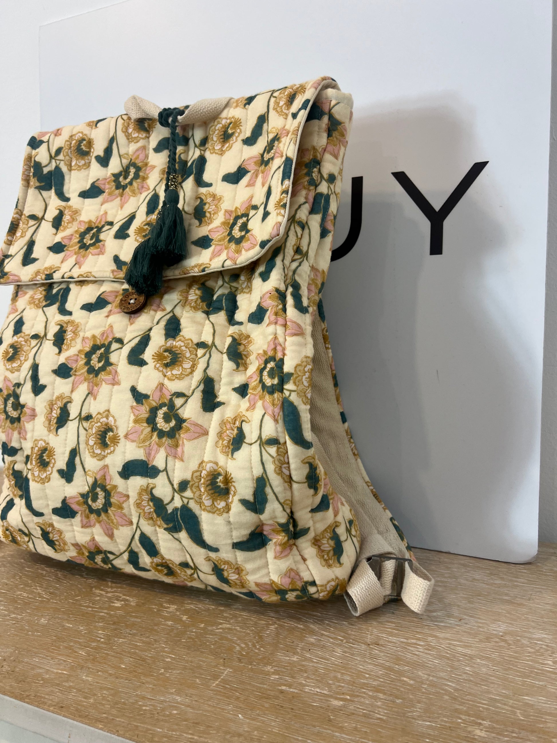 mochila beige con flores. 100%algodon. Asas ajustables.