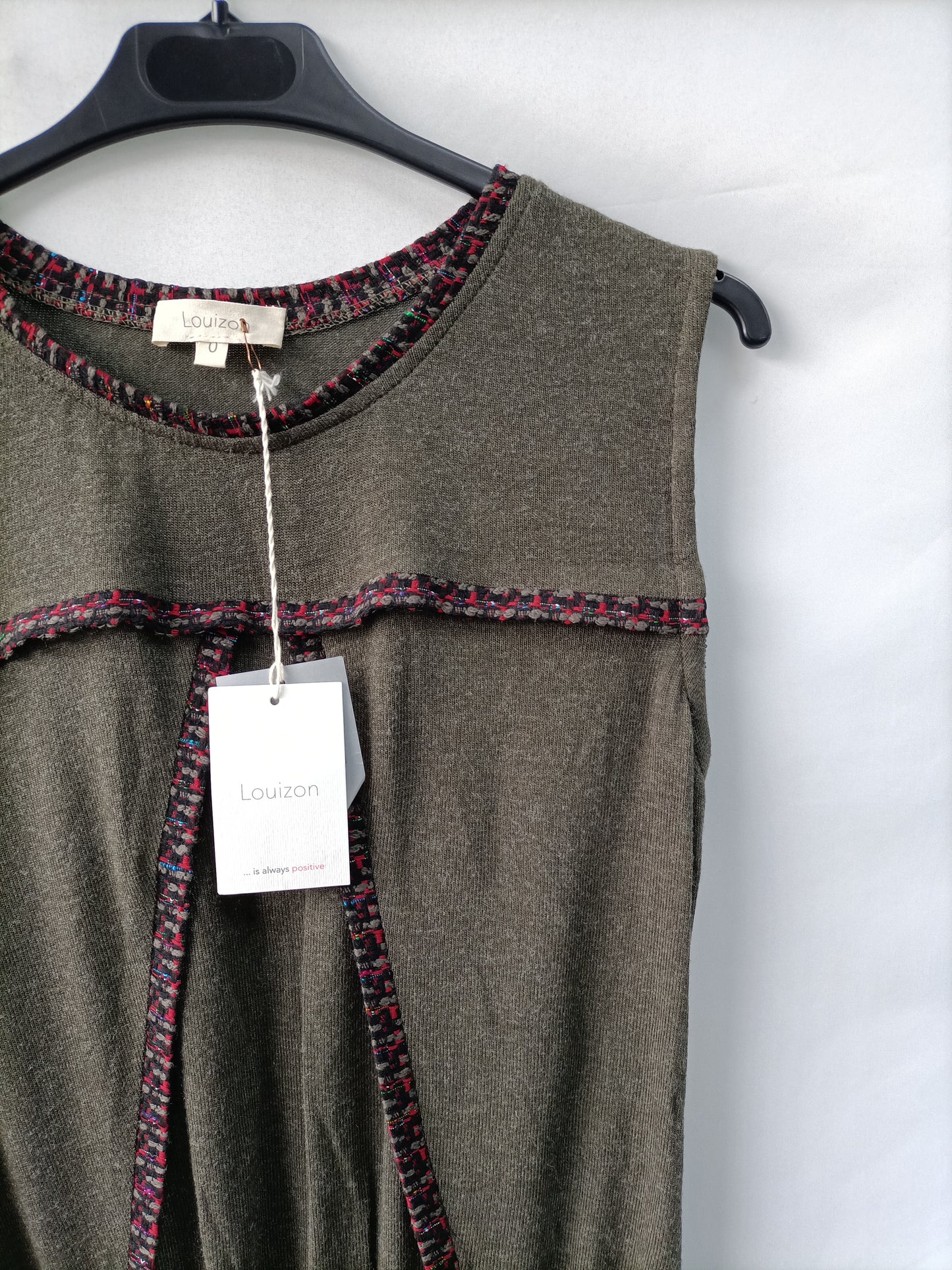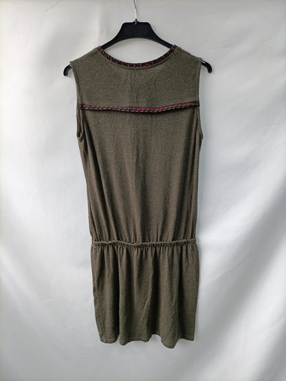 Vestido corto verde kaki con detalles en tono rojo y negro. Es elástico y tienes corte en la cintura. Largo 92 cm