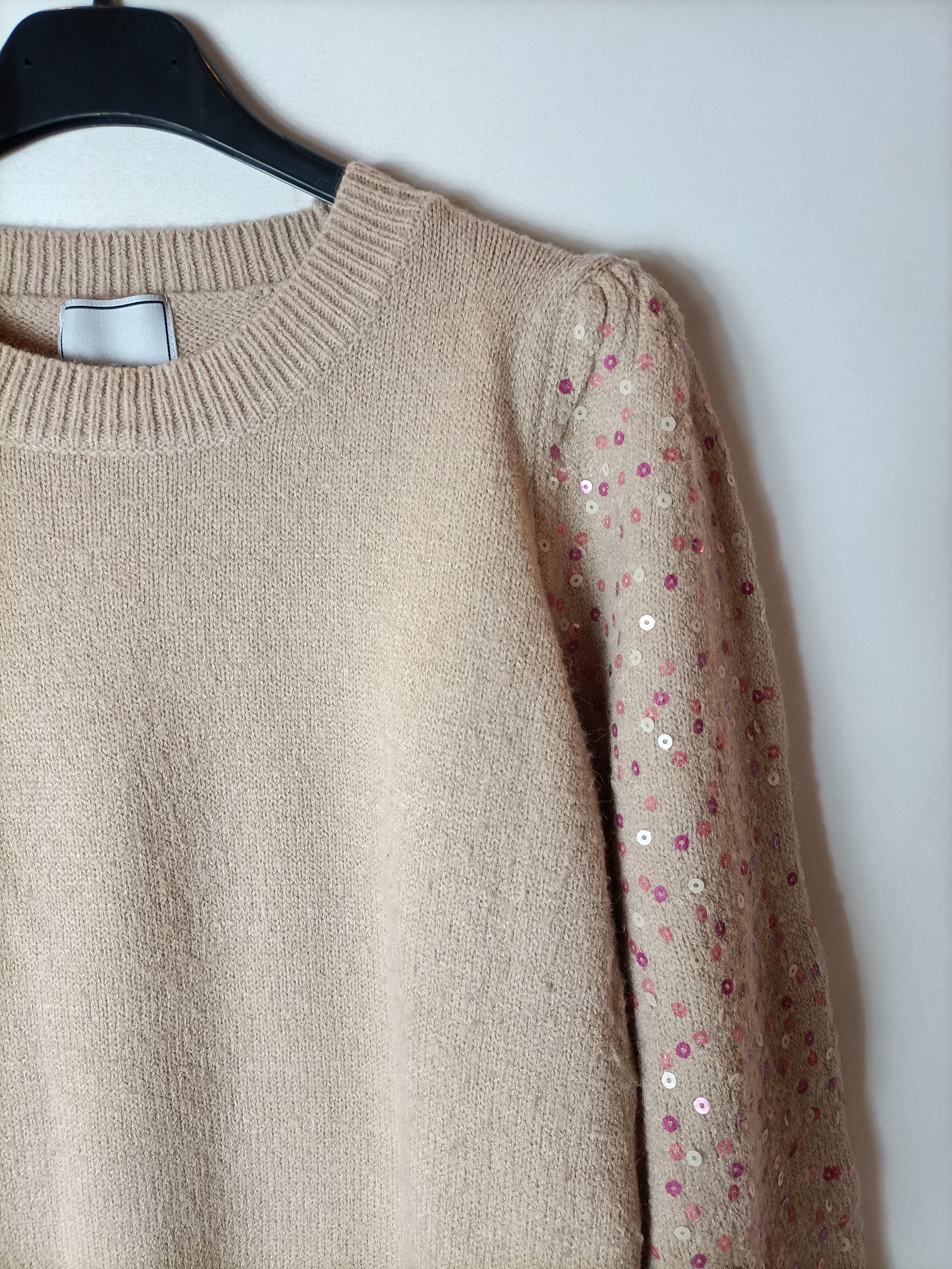 Jersey beige manga abullonada y lentejuelas en tonos rosas y beige. cm