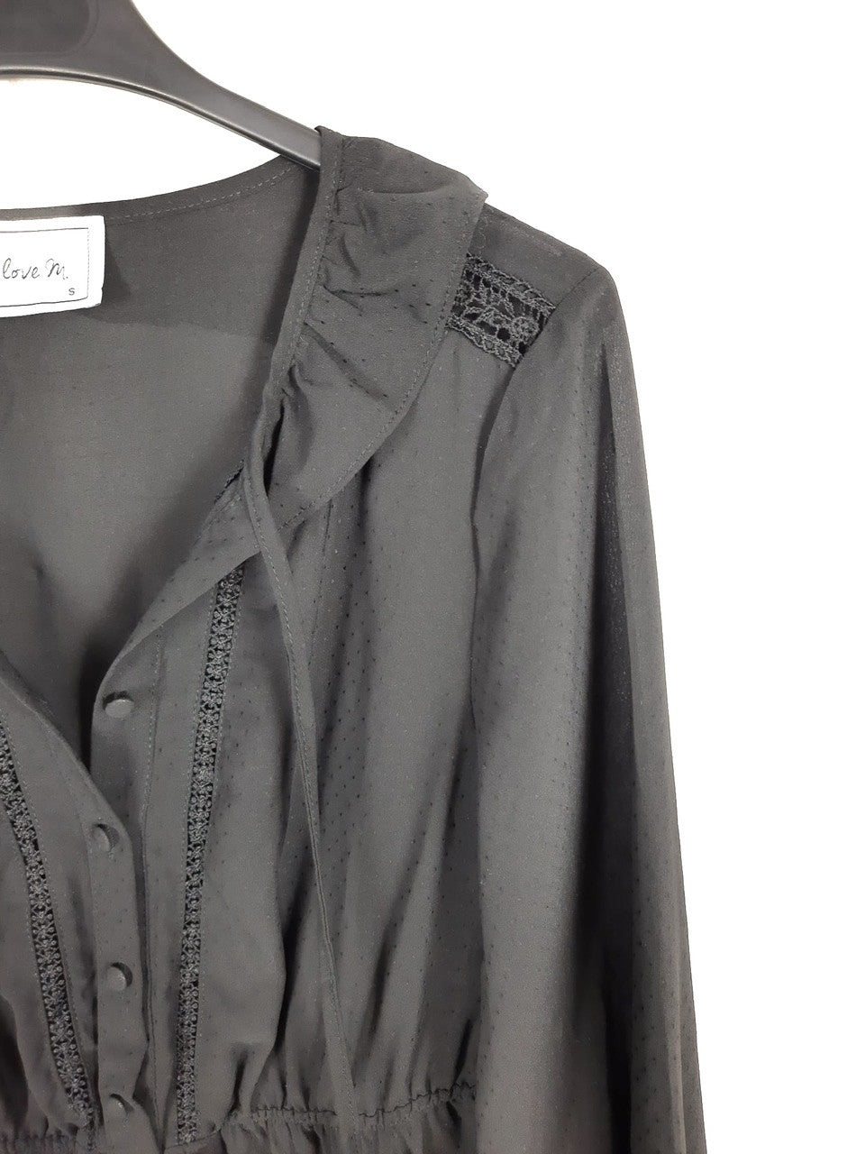 Love m. Vestido negro fluido con detalle de volantes y encaje. Abotonado hasta la cintura. Cintura elástica. No elástico. De sisa a sisa 45 cm largo 87 cm