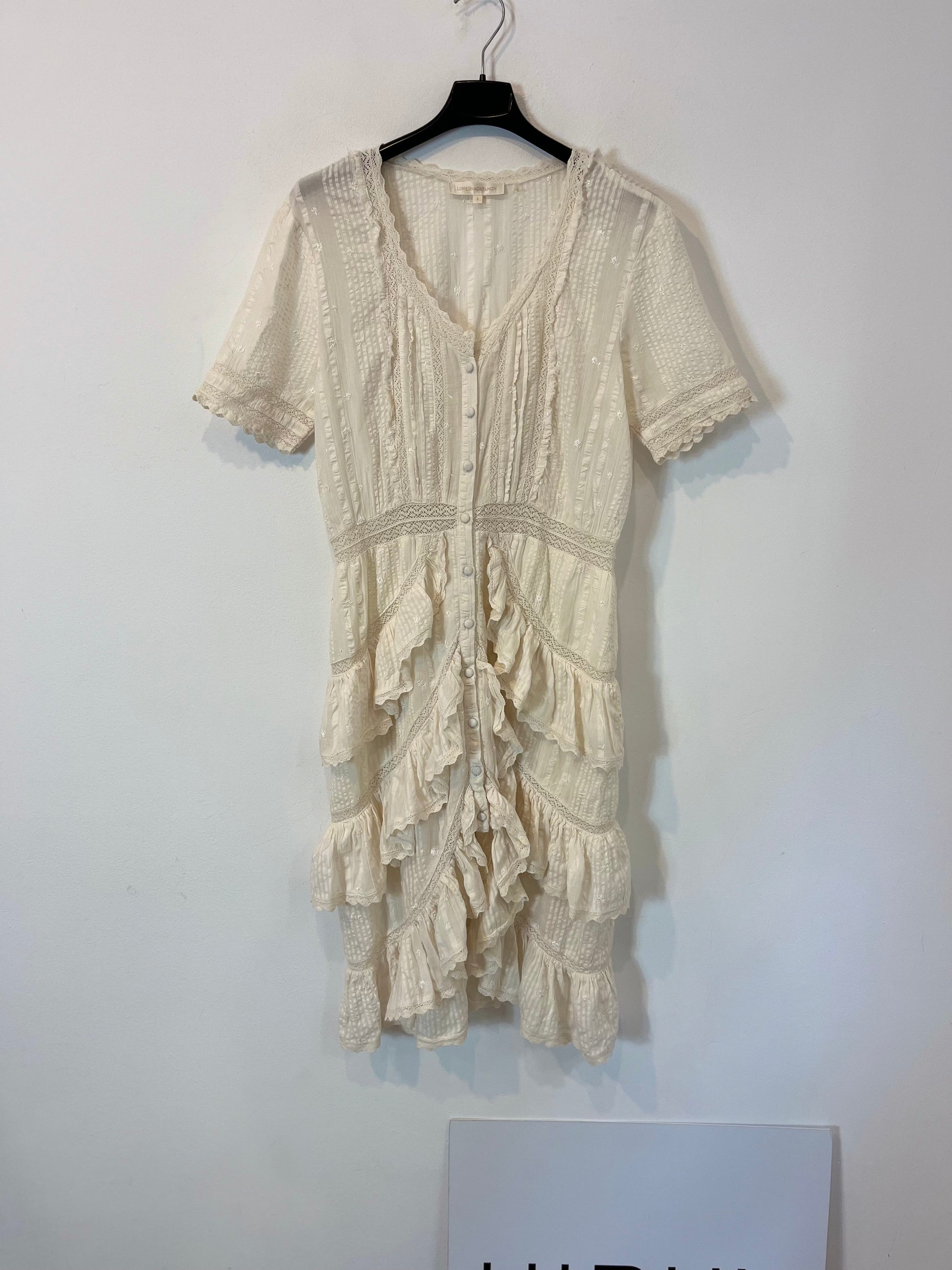 No elástico. Vestido volantes banco roto. Espalda 47 cm, cintra 36 cm, largo 100 cm.