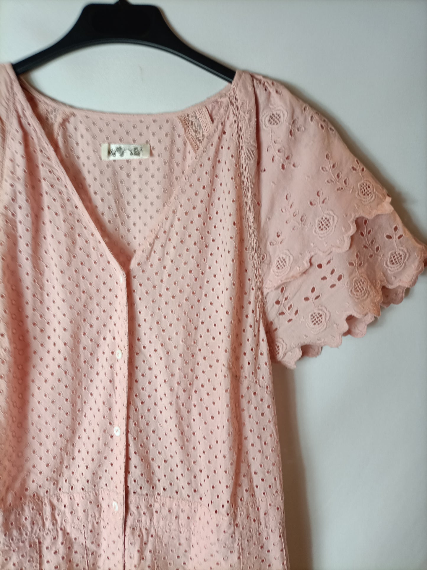 100% algodón. Vestido largo troquelado rosa palo. Forro en la parte de la falda. Cintura elástica en la parte trasera. De sisa a sisa 40 cm