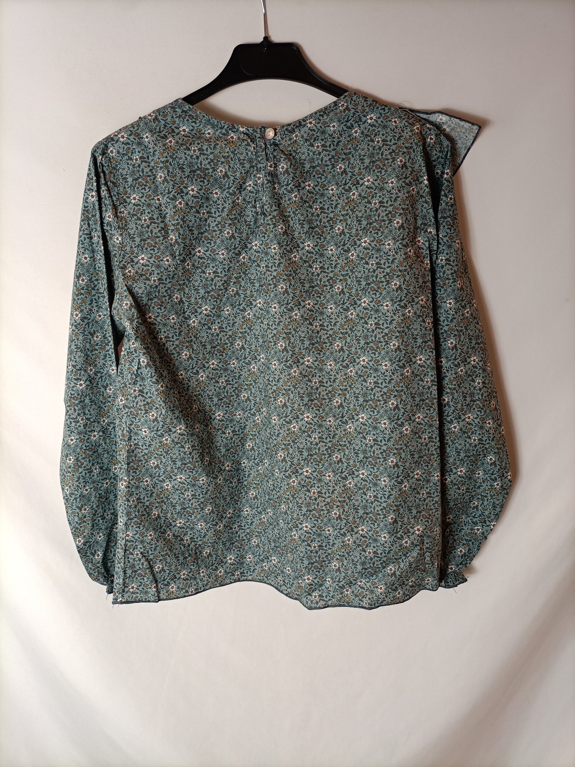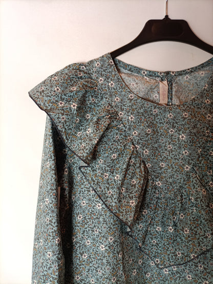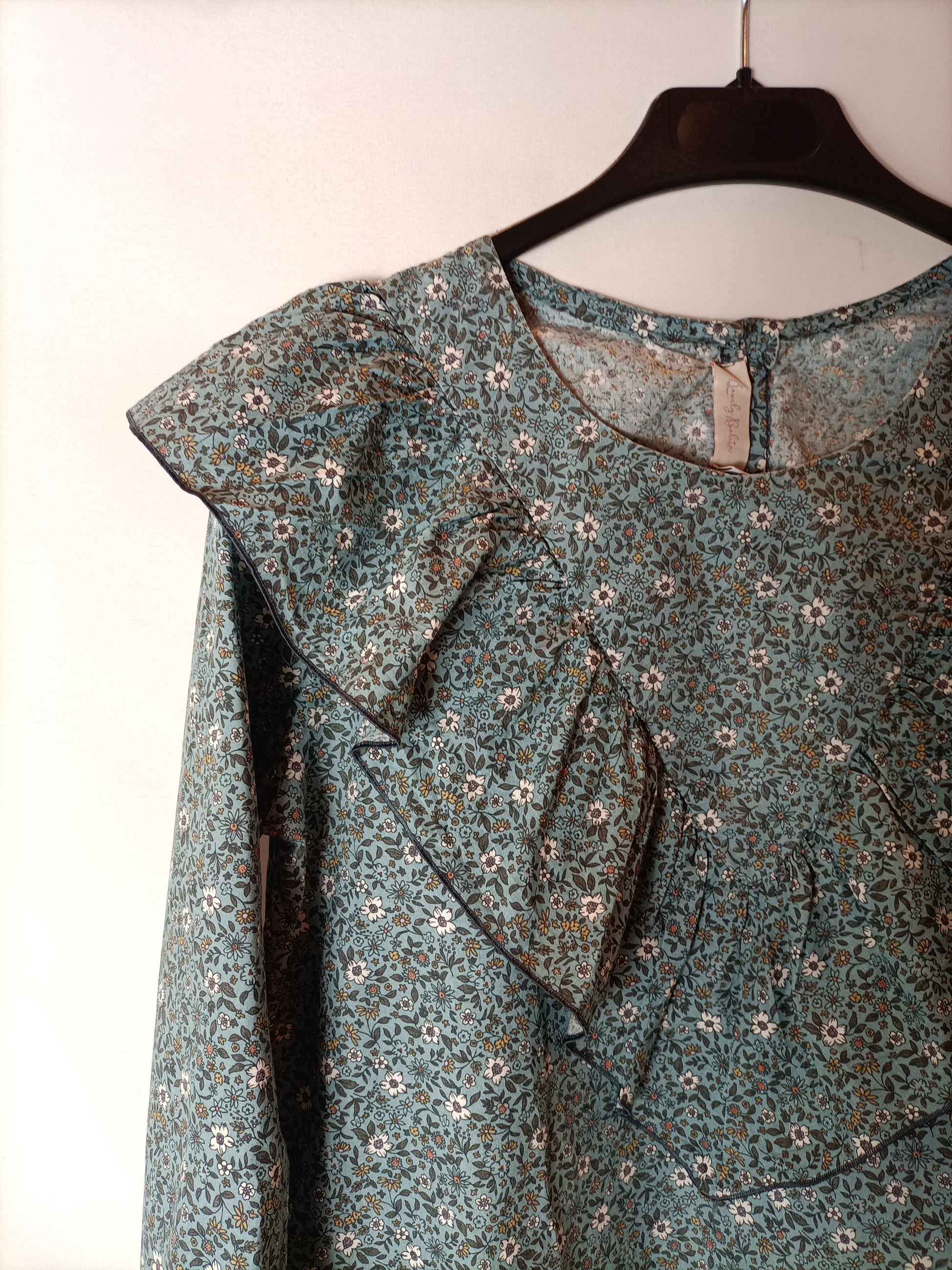 Blusa azul verdoso con flores y detalle de volante. No elástica. De sisa a sisa 44 cm