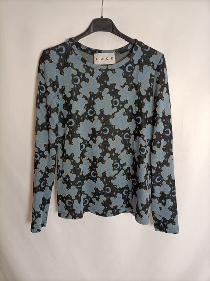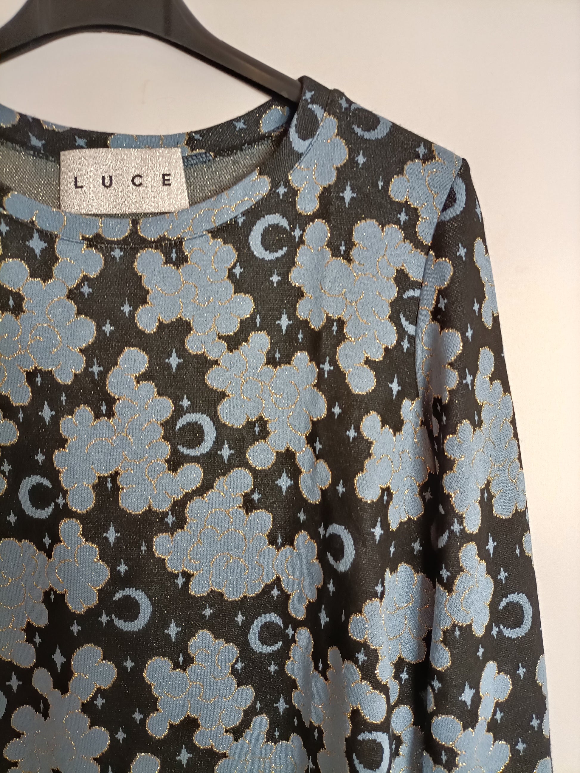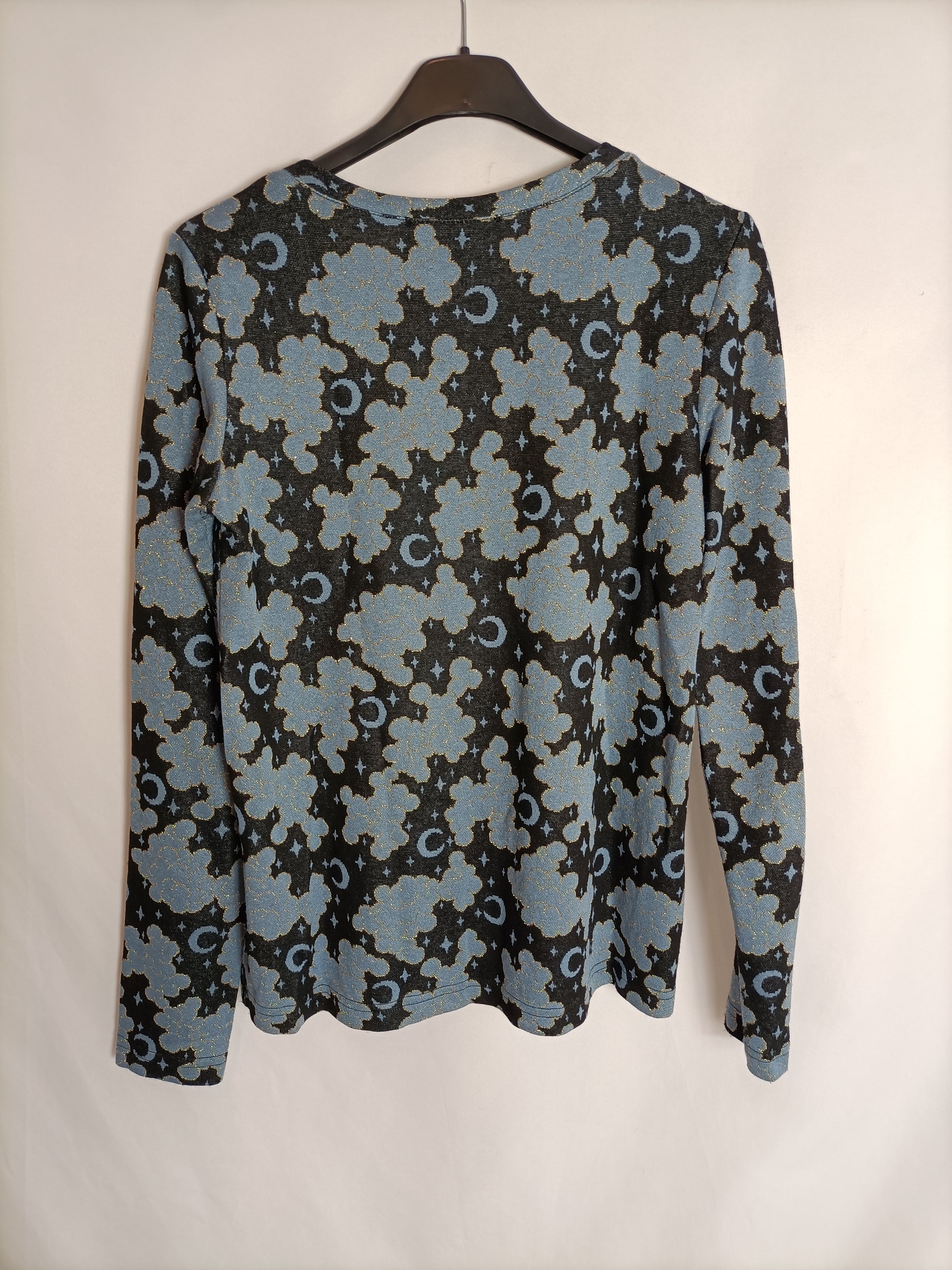 camiseta azul oscuro con estampado de nubes. Detalle de hilos dorados.