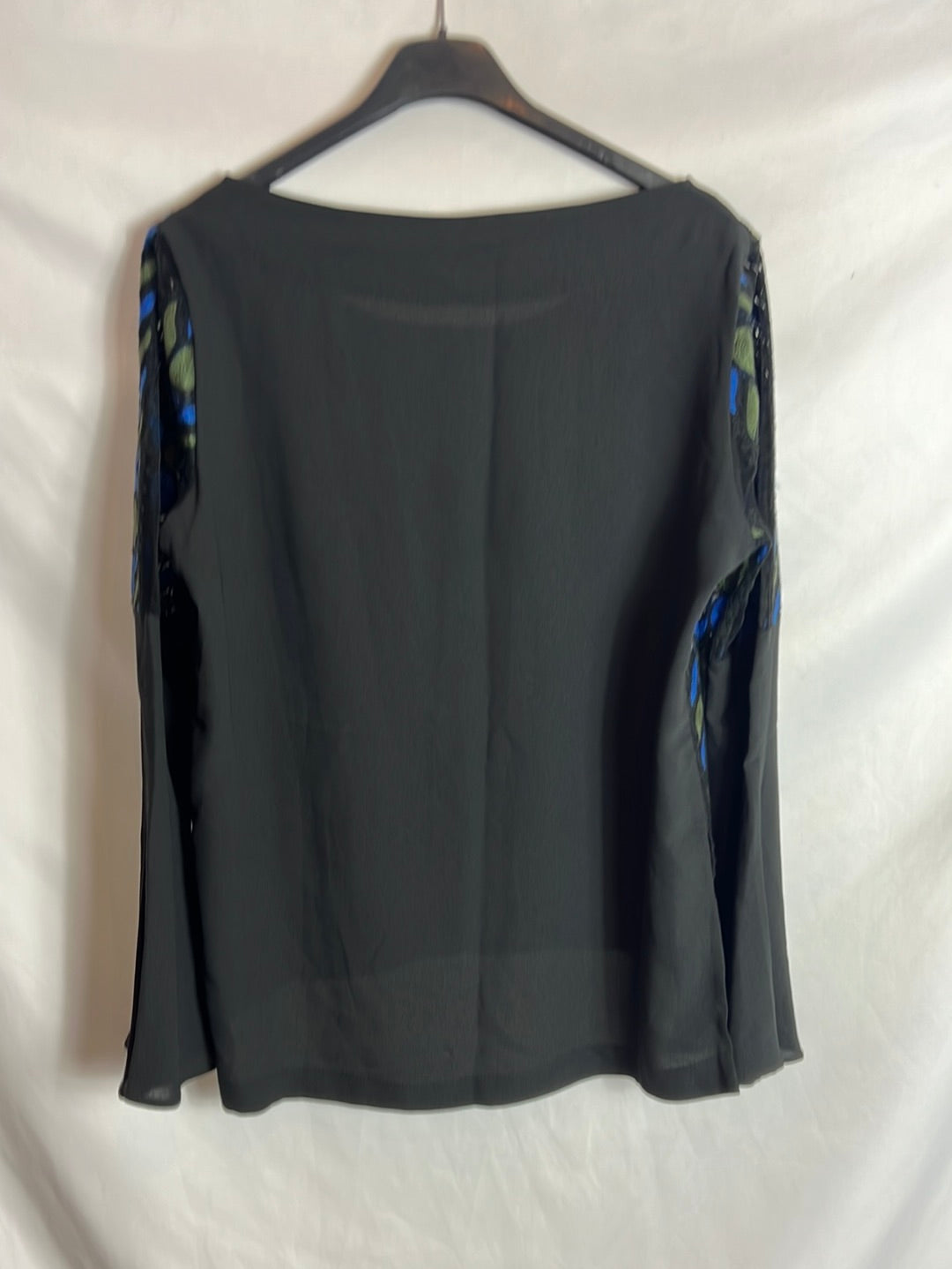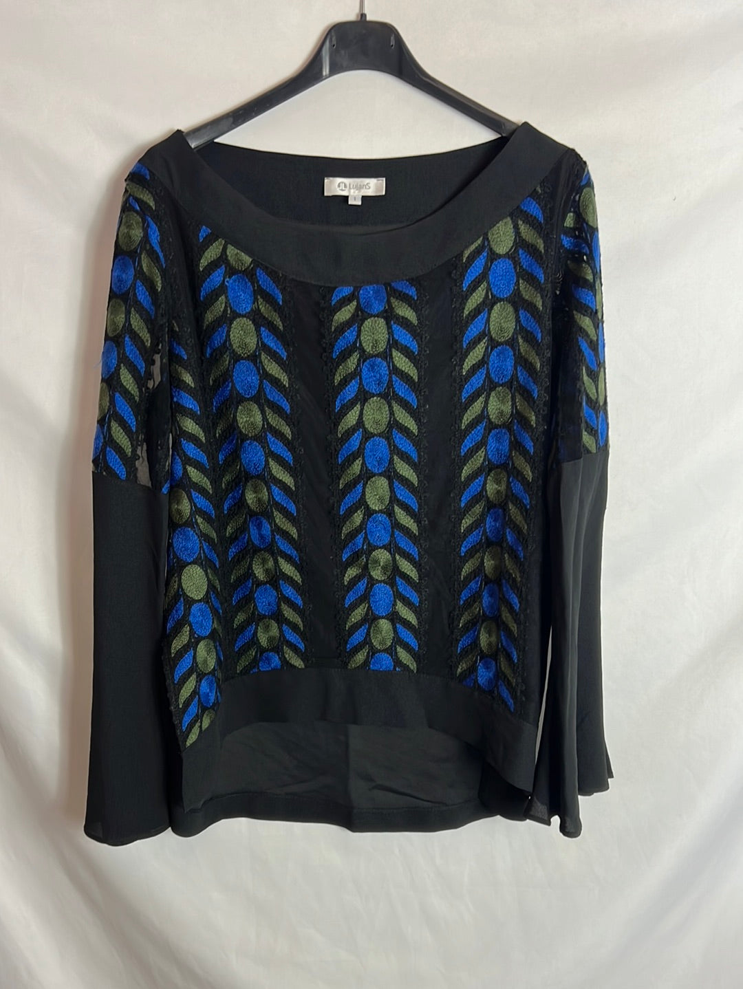 Top negro bordados geométricos verdes y azules. Hombros 40cm, largo 65cm