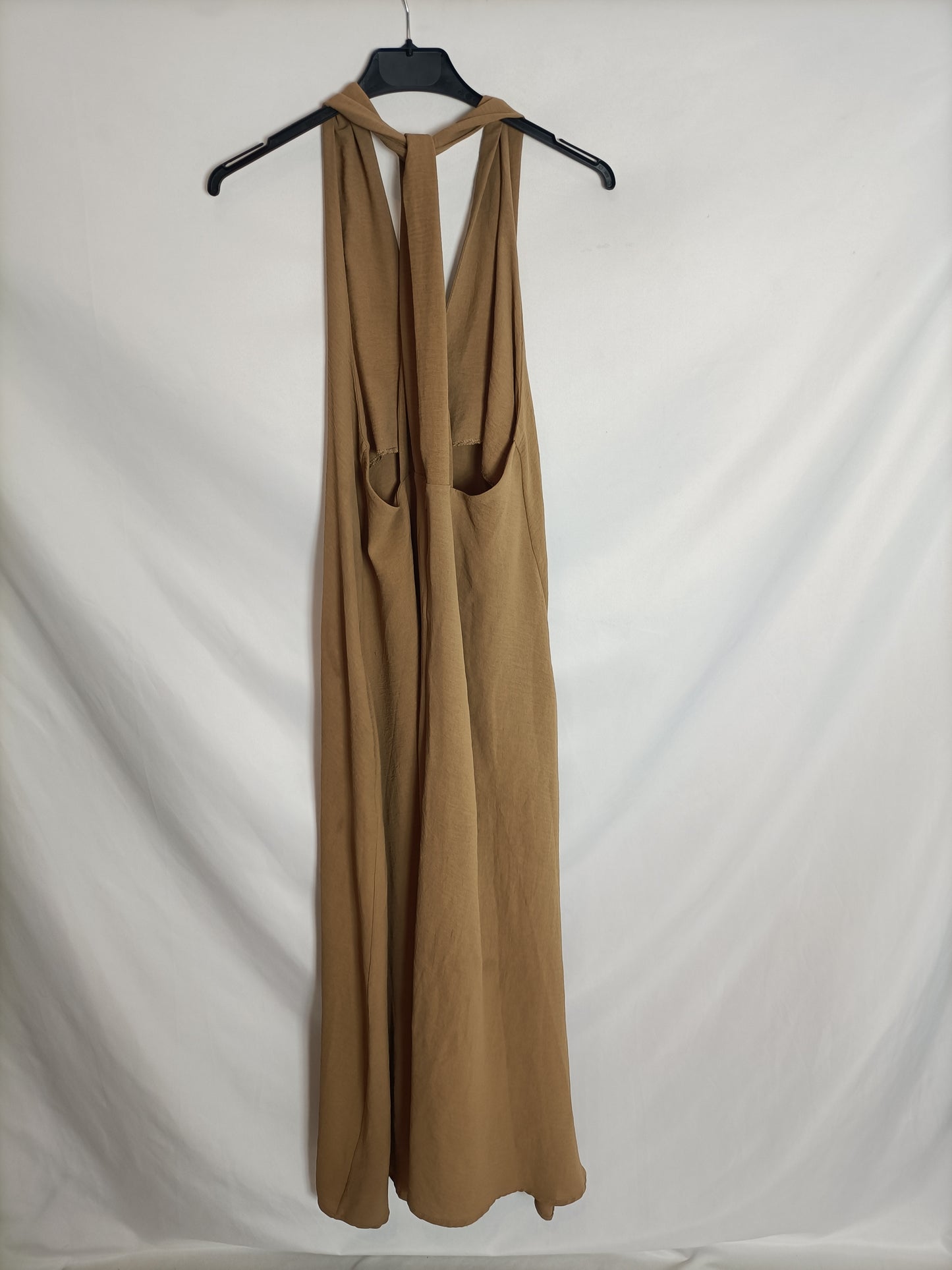 vestido largo camel con escote halter y tirantes cruzados. fluido. (da más talla)