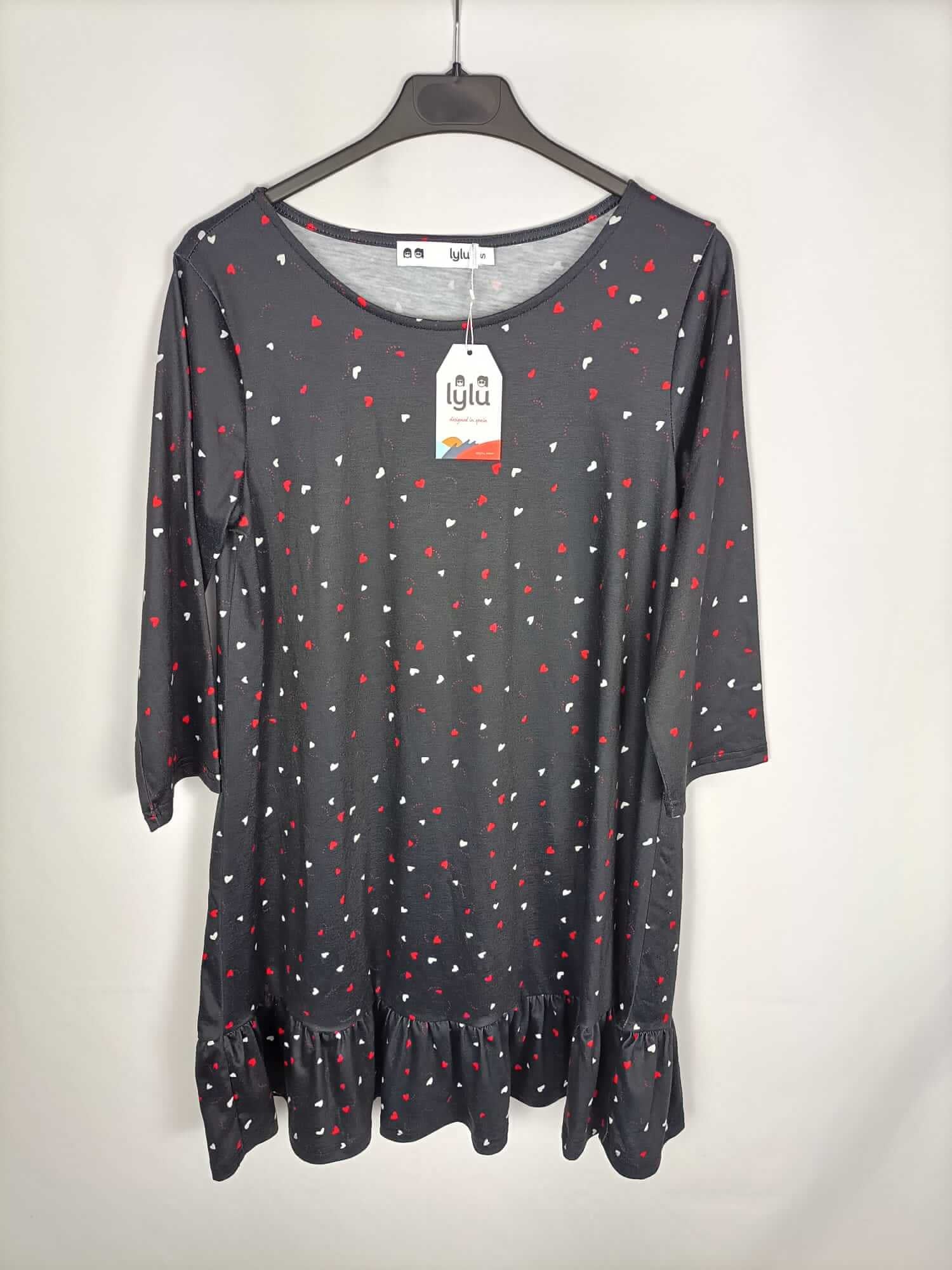 Lylu. NUEVO CON ETIQUETA. Vestido azul muy oscuro con corazones en rojo y blando. Falda con volante. Elástico. Largo 85 cm