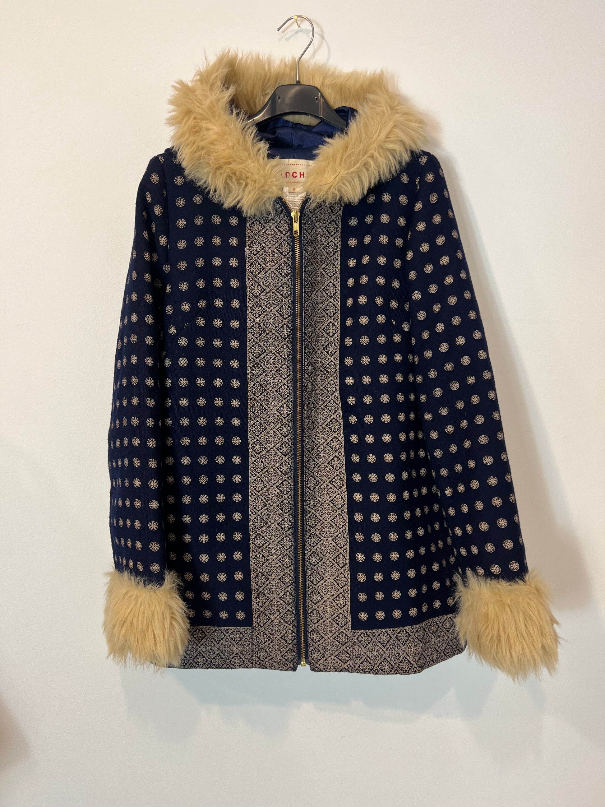 Chaqueta azul estampada capucha pelo. Hombros 38cm, de sisa a sosa 44cm, largo 73cm