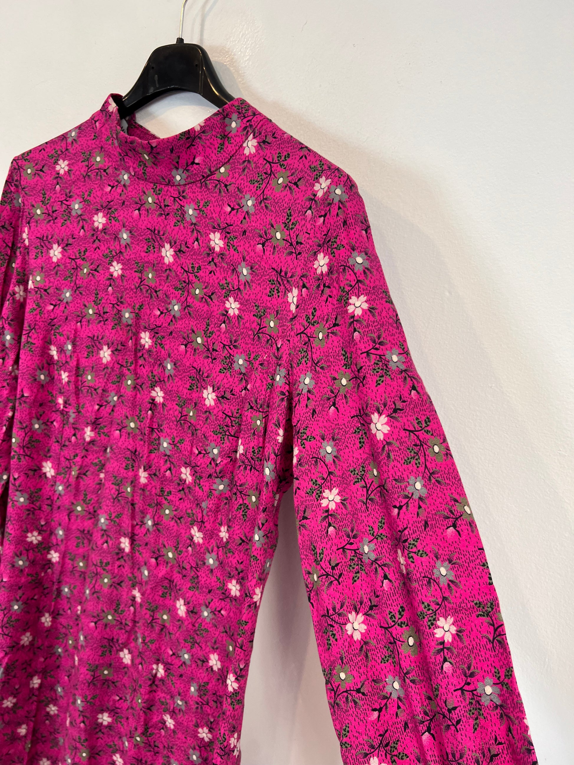 Vestido largo rosa con estampado de flores. Cuello perkins con botones. No elástica. de sisa a sisa 47 cm largo 131 cm