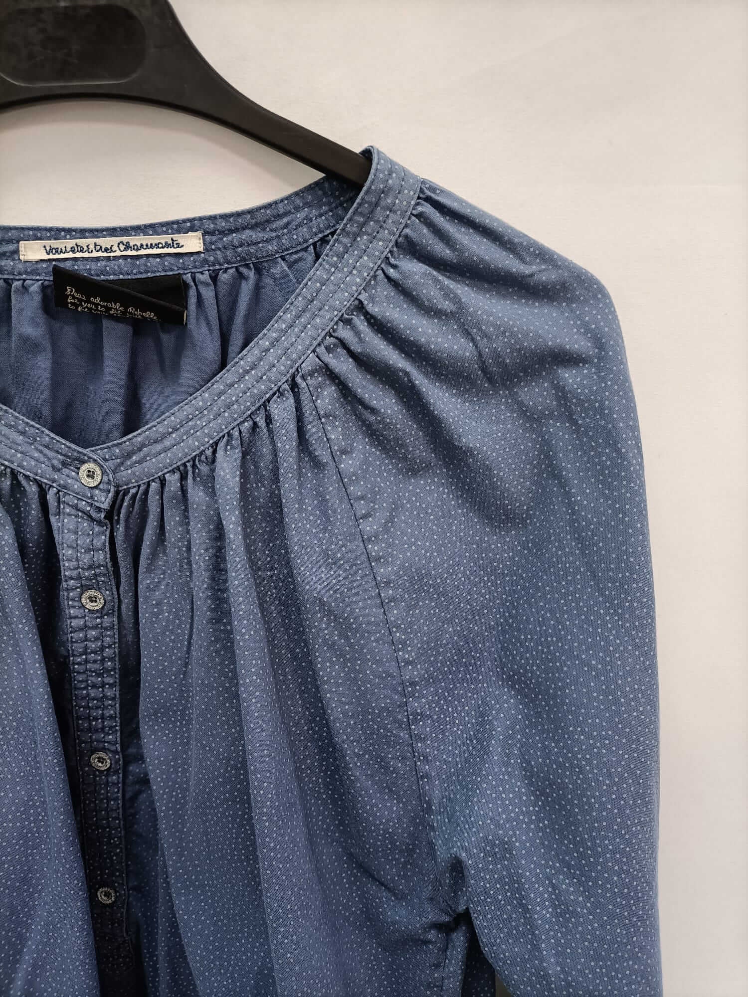 Maison scotch. Tu (s/m). Blusa azul de tejido denim finito con lunares blancos pequeños. No elástica. De sisa a sisa 55 cm largo 70 cm