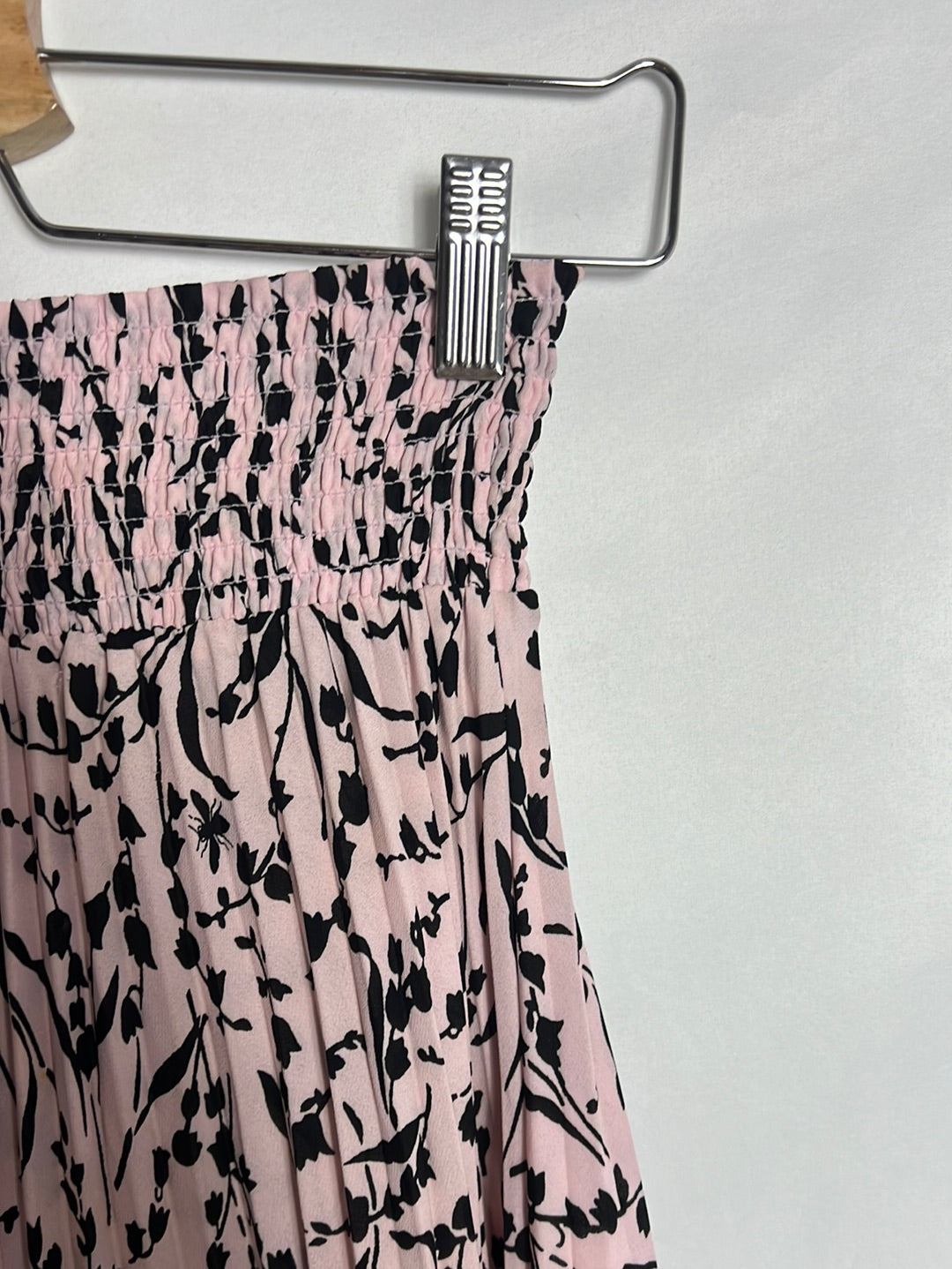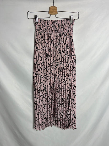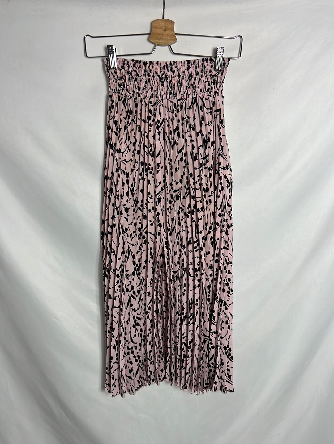 falda midi de tablas rosa con florecitas. Largo 83cm, cintura elástica