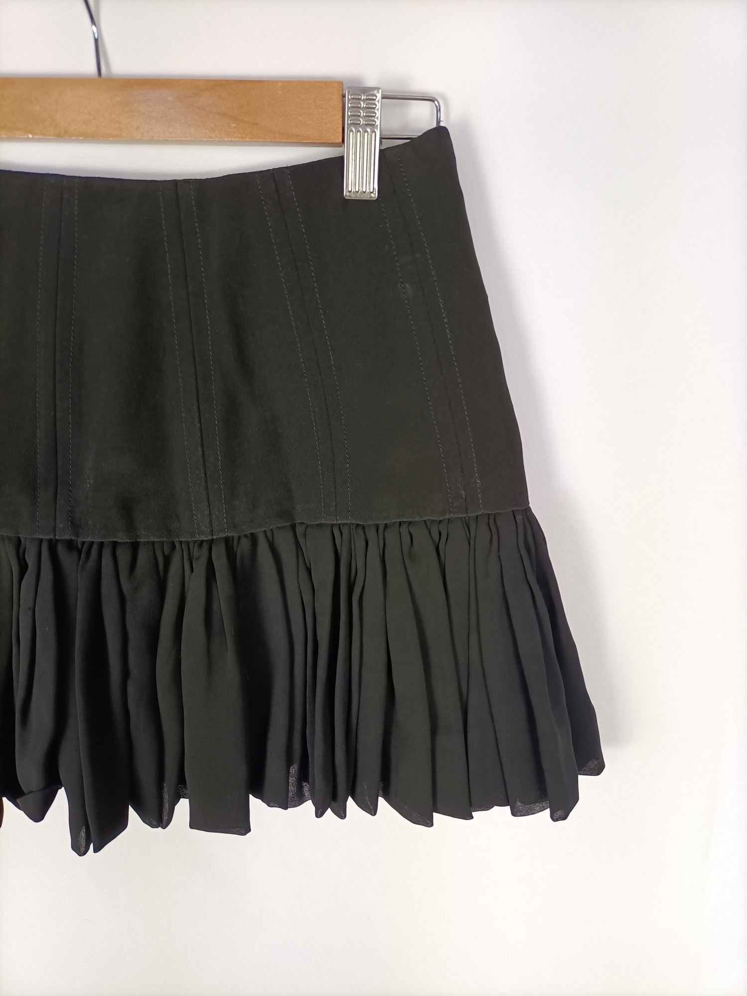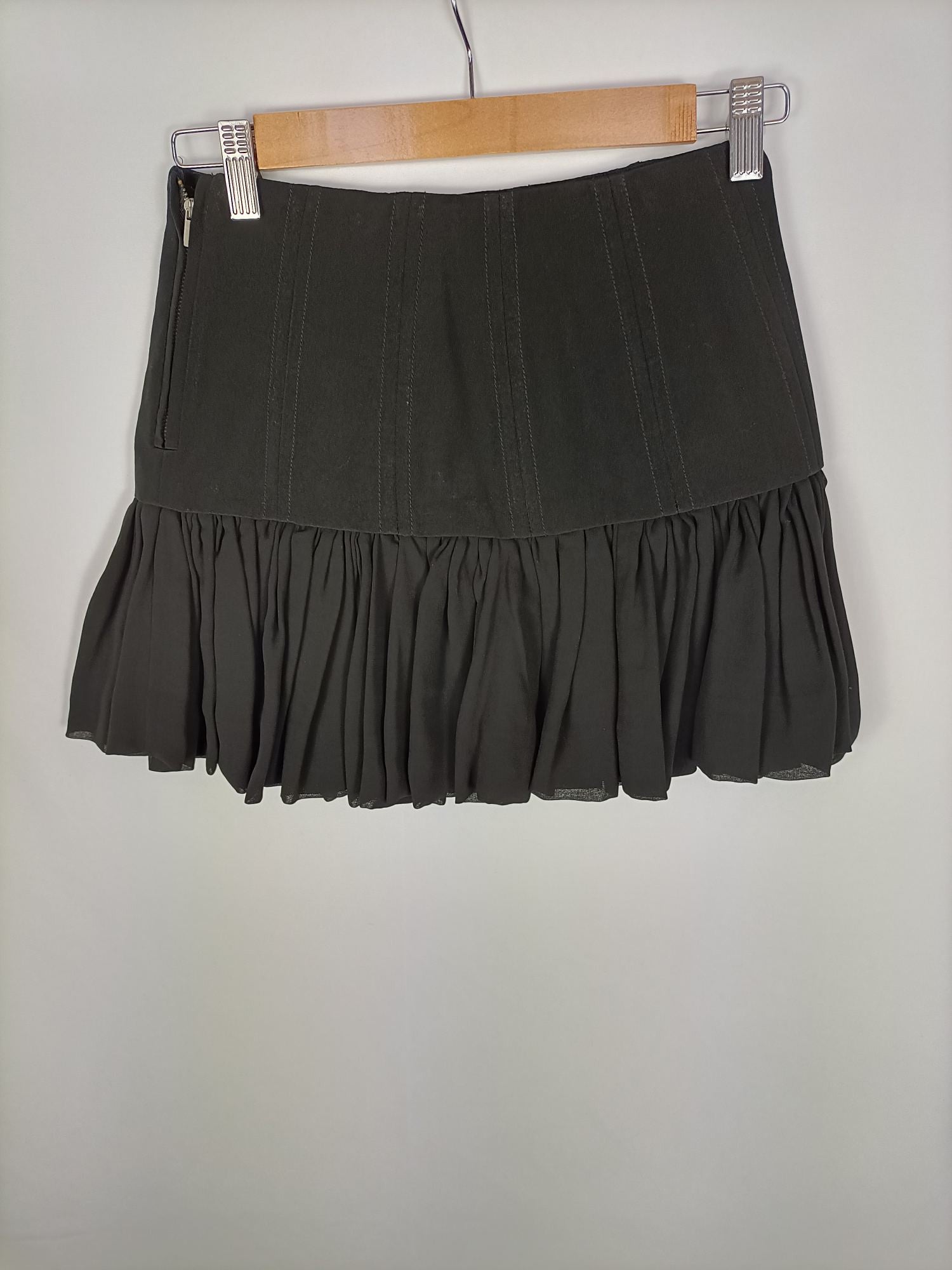 Maje. 34. Falda mini negra doble textura con la cintura ajustada y mini volante fluido. No elástica. Cintura 34 cm largo 35 cm.